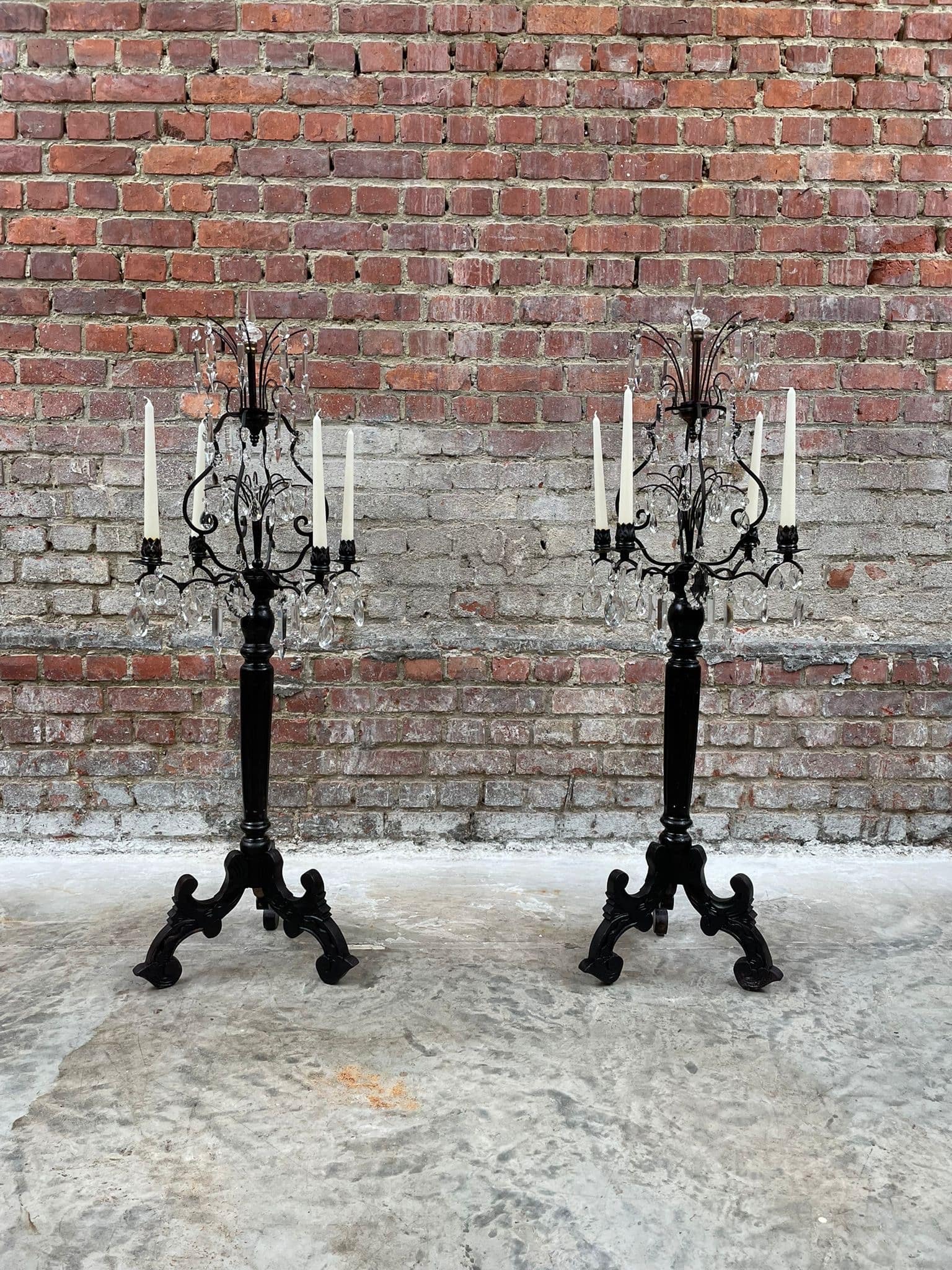 Set van 2 antieke staande kandelaars met kristallen pendels