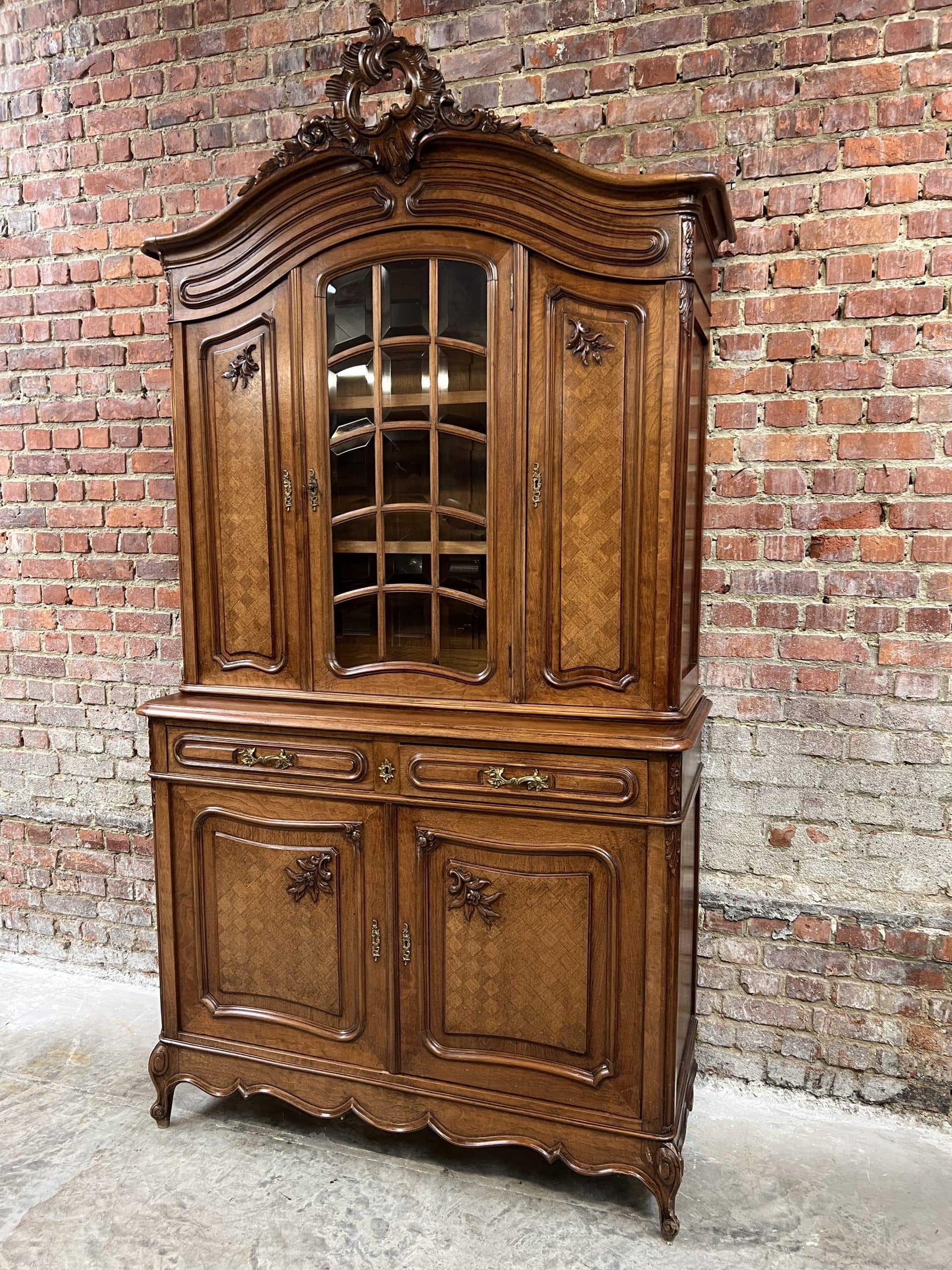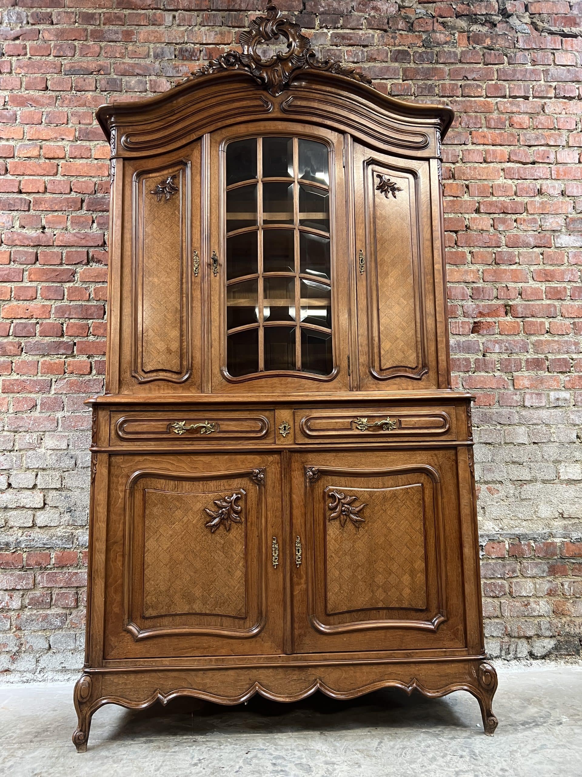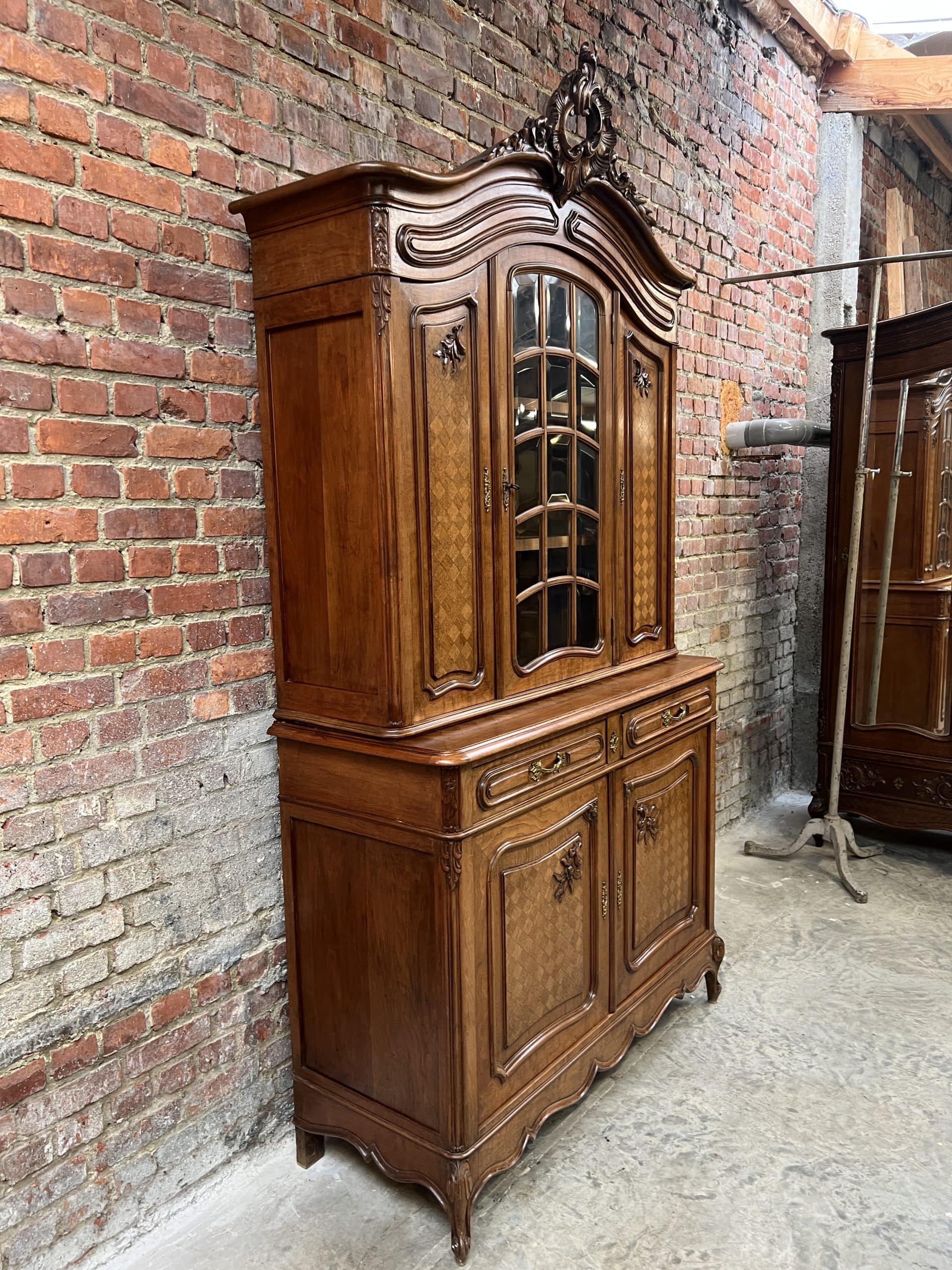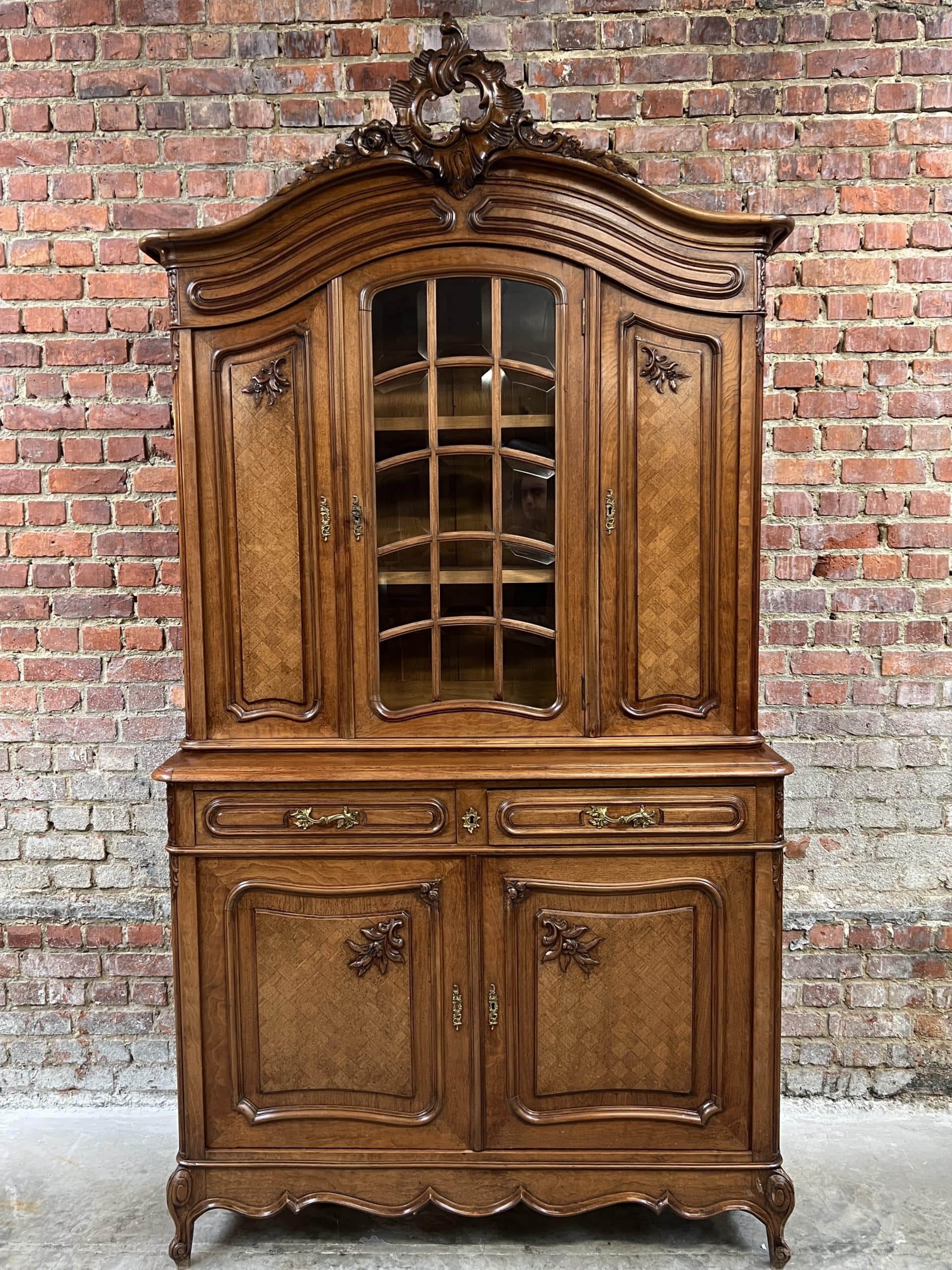 Een elegante buffetkast in Franse Louis XV-stijl, met verfijnde houtsnijwerken en een glazen deur met rasterwerk in het bovenste gedeelte. Het onderste deel bevat twee deuren en twee lades. De sierlijke poten en gebogen kroonlijst benadrukken de klassieke uitstraling.