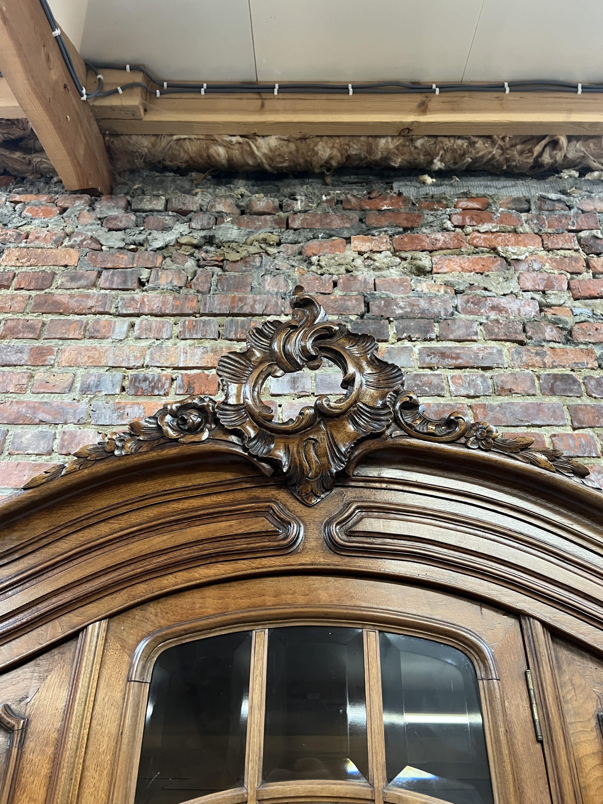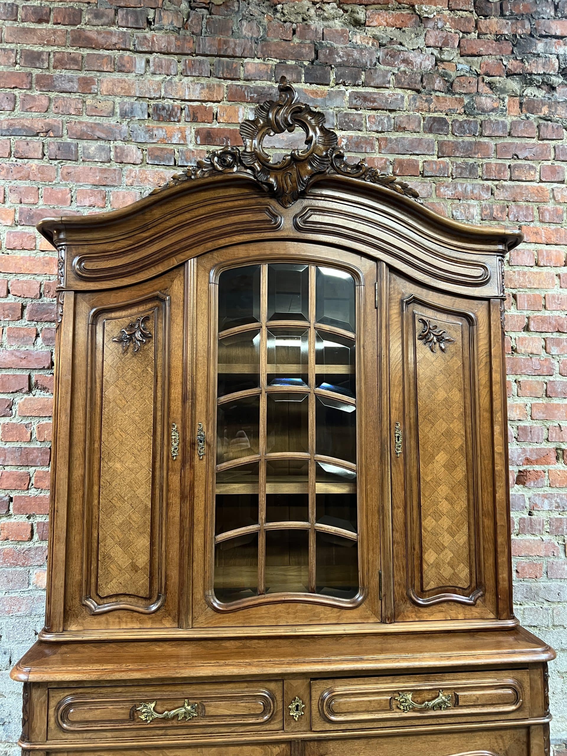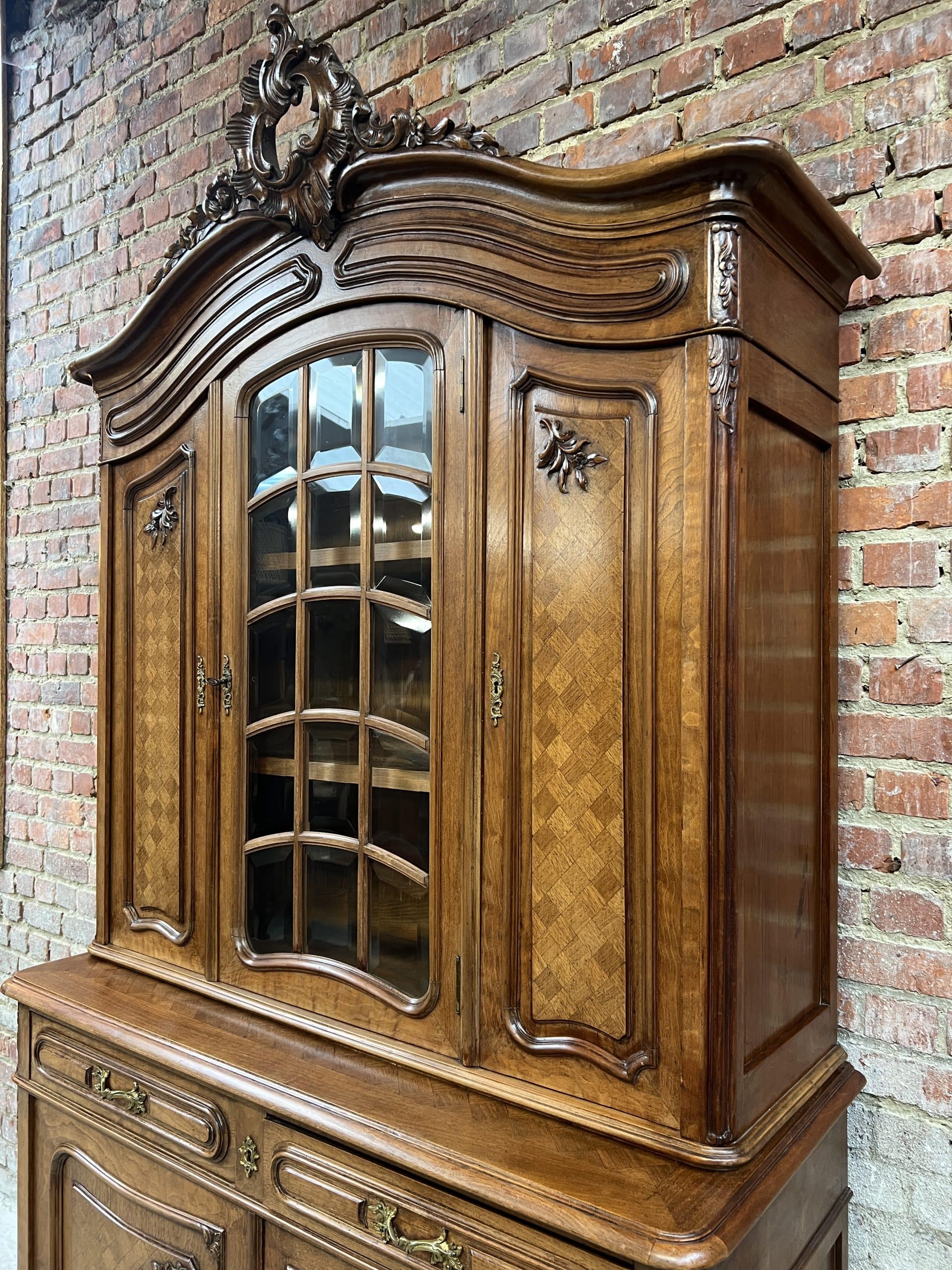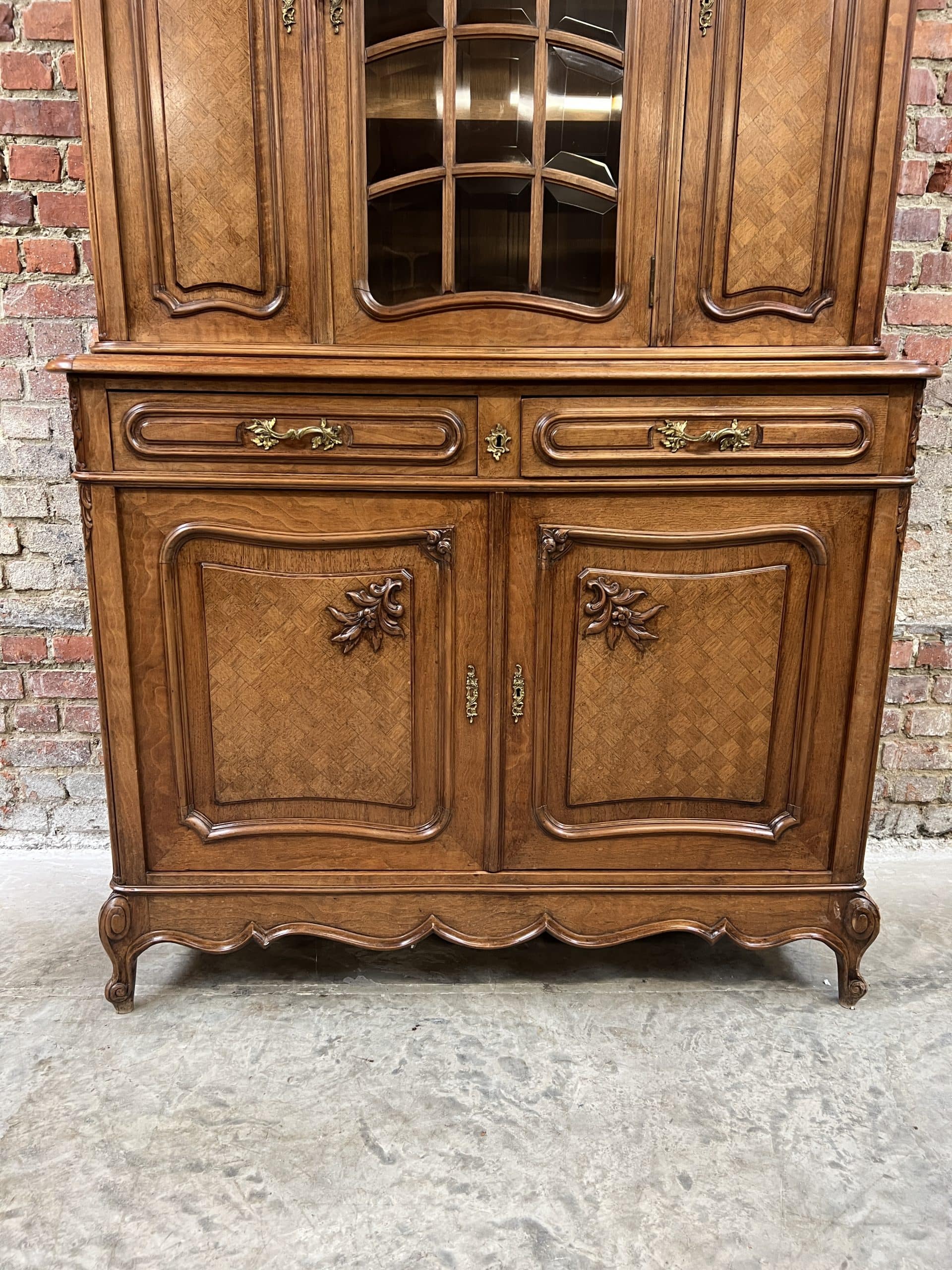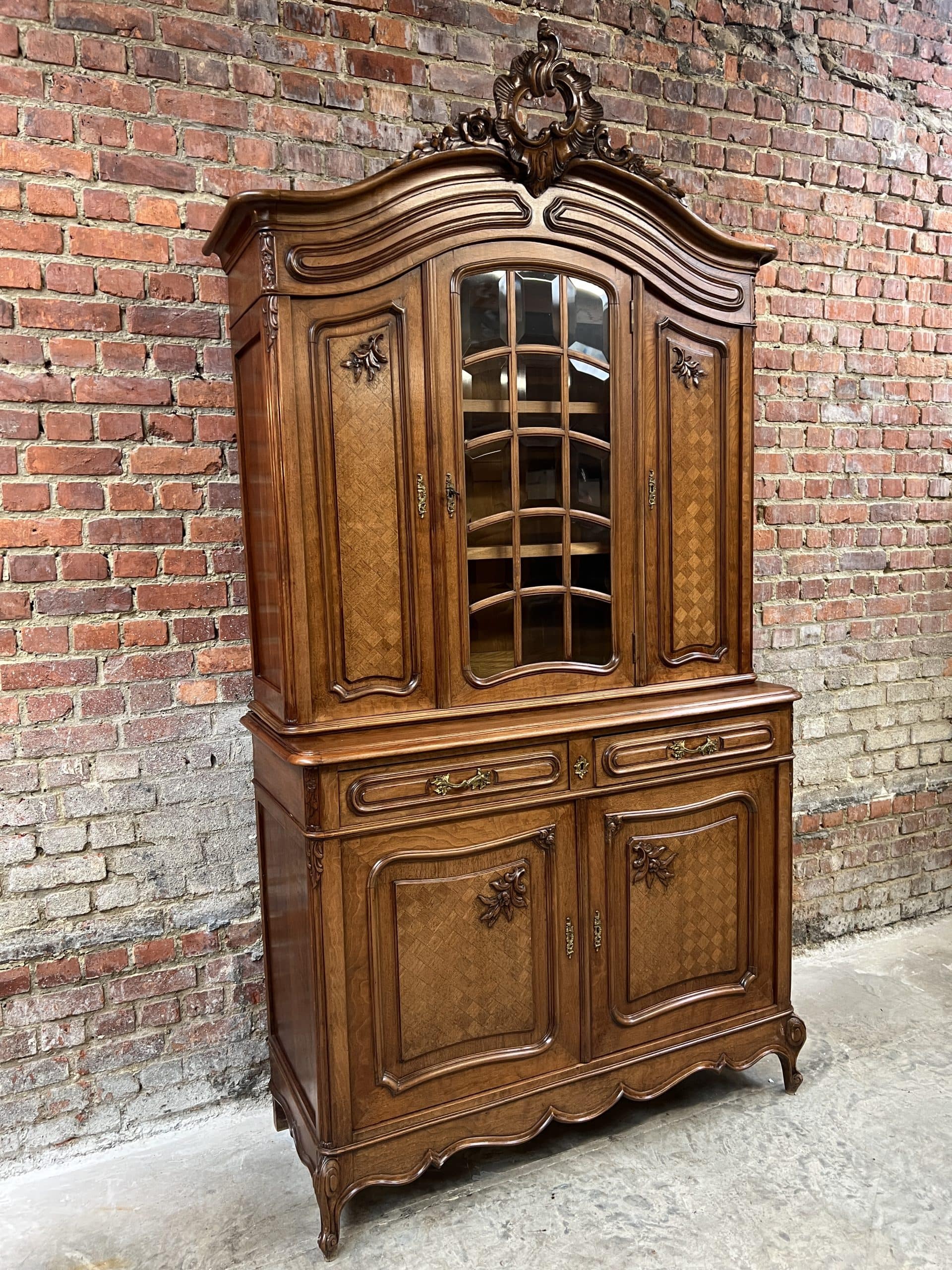 Een elegante buffetkast in Franse Louis XV-stijl, met verfijnde houtsnijwerken en een glazen deur met rasterwerk in het bovenste gedeelte. Het onderste deel bevat twee deuren en twee lades. De sierlijke poten en gebogen kroonlijst benadrukken de klassieke uitstraling.