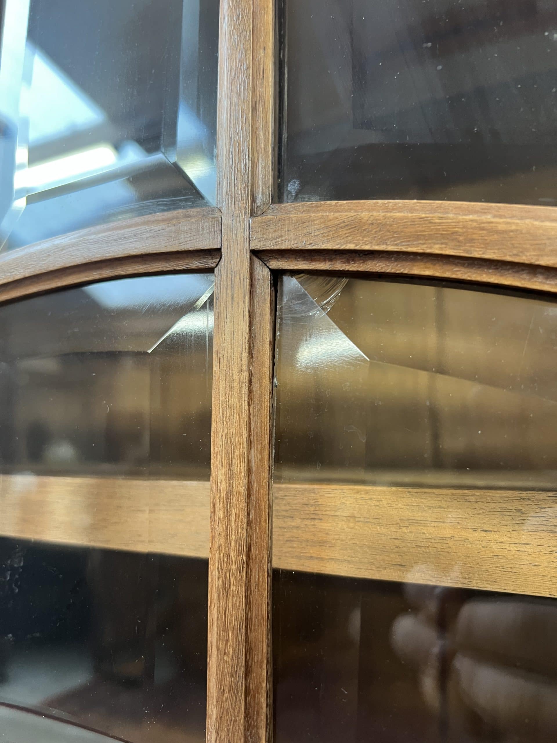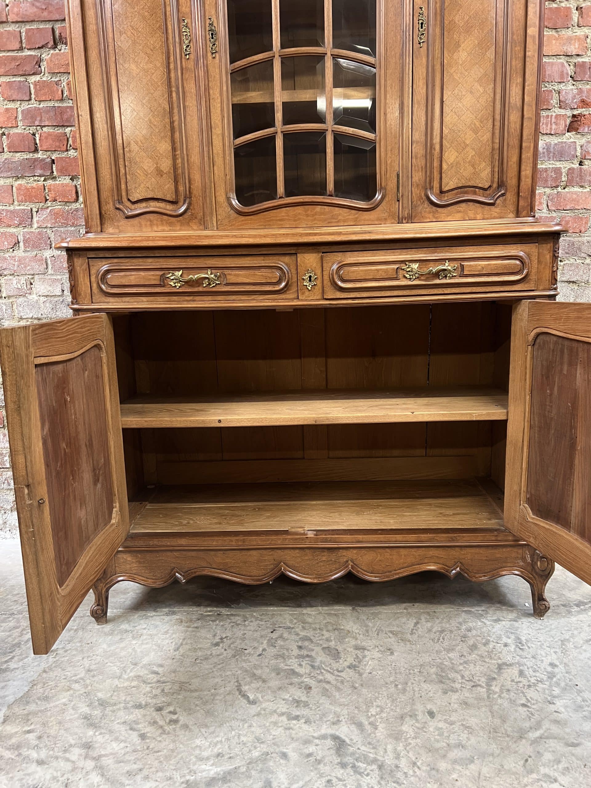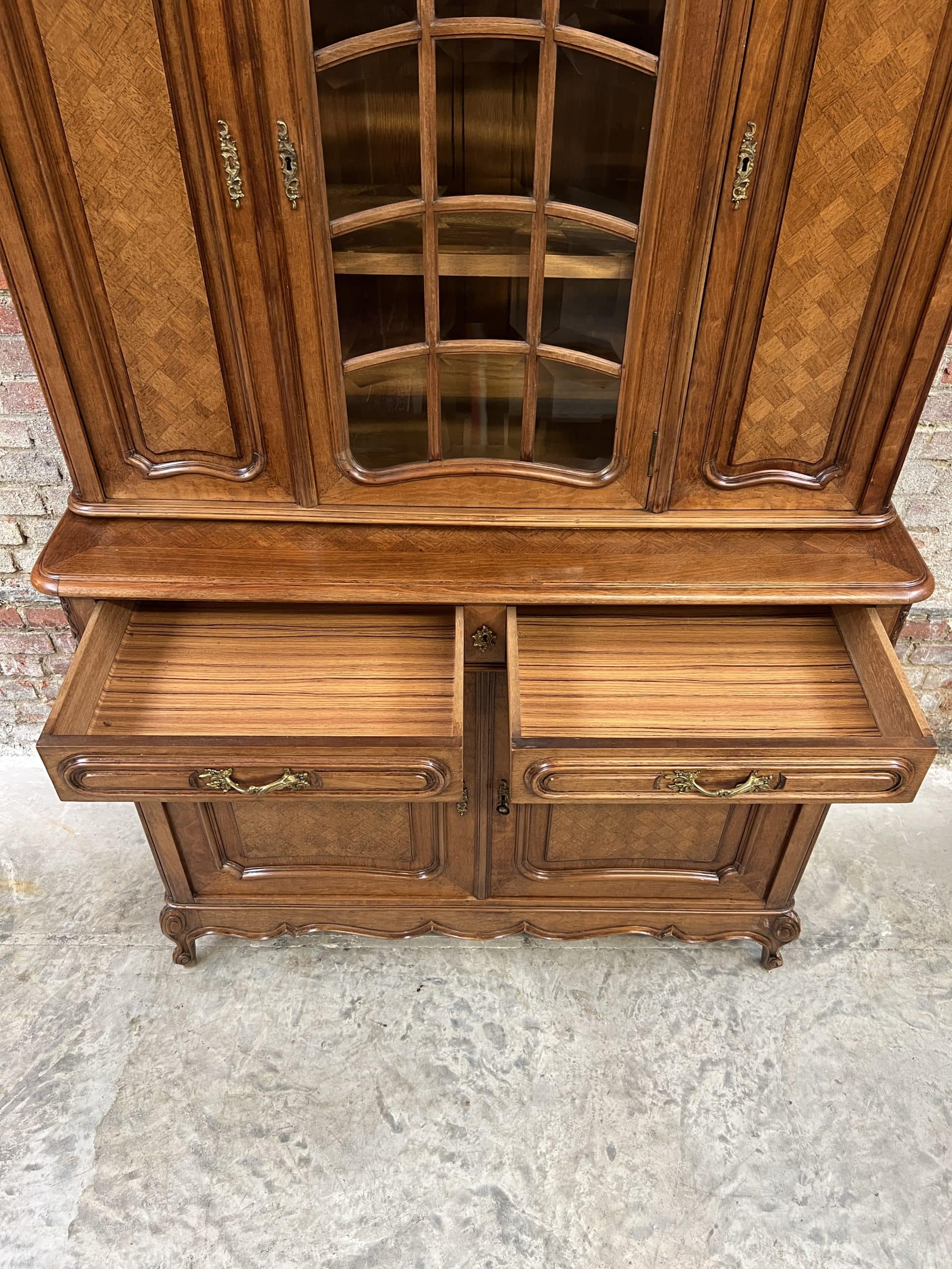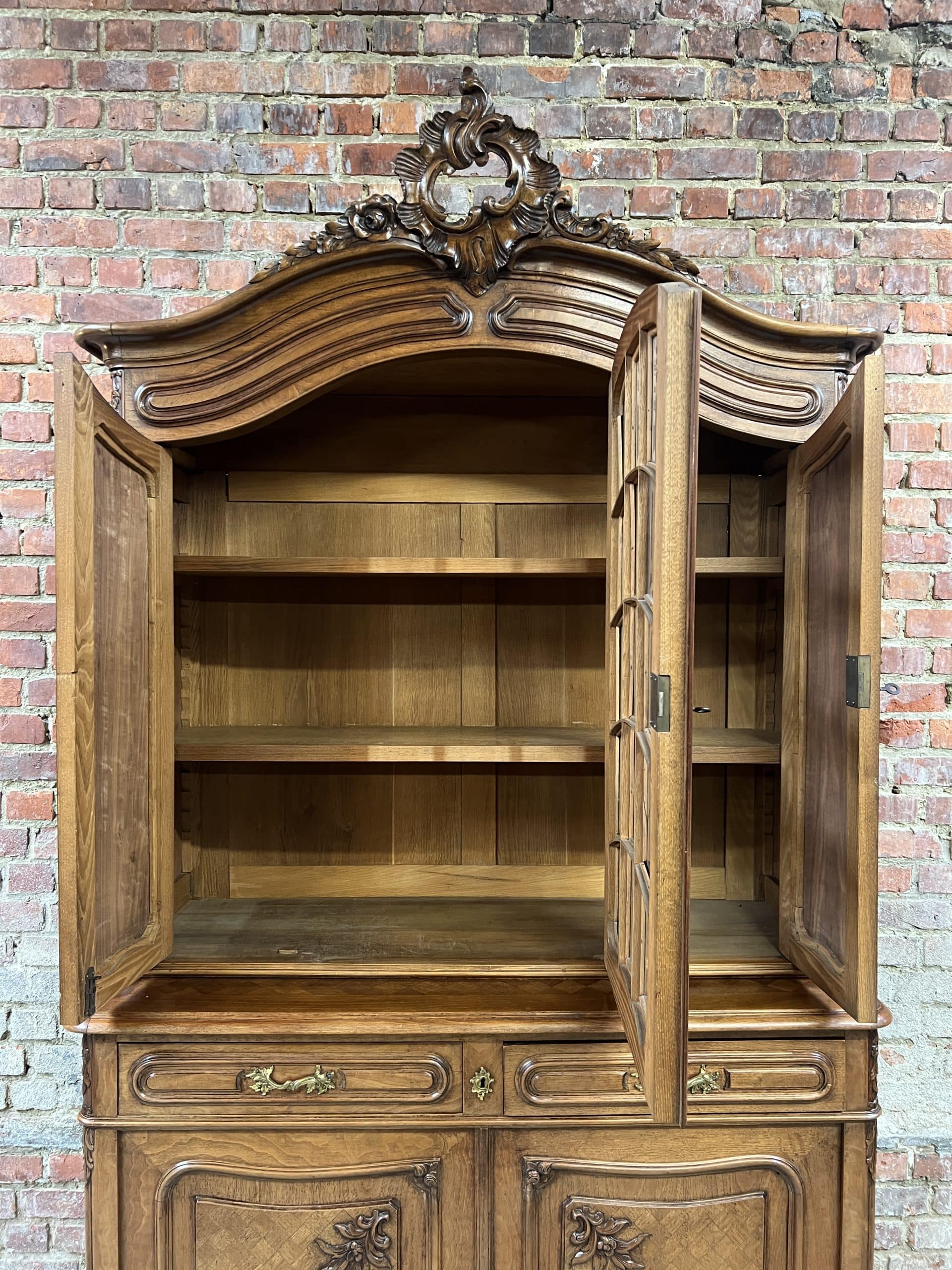 Een elegante buffetkast in Franse Louis XV-stijl, met verfijnde houtsnijwerken en een glazen deur met rasterwerk in het bovenste gedeelte. Het onderste deel bevat twee deuren en twee lades. De sierlijke poten en gebogen kroonlijst benadrukken de klassieke uitstraling.