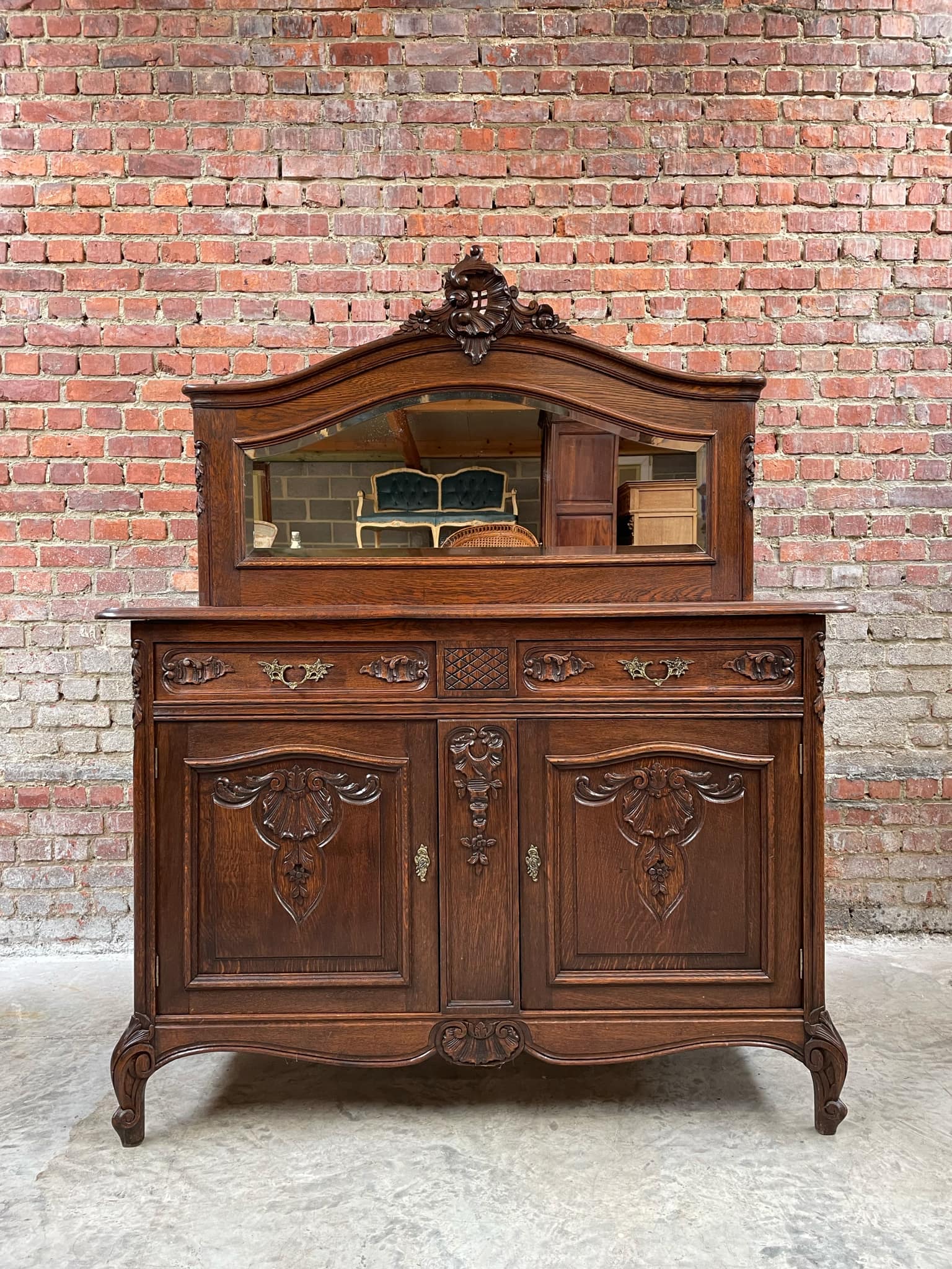 Deze elegante buffetkast, vervaardigd uit massief eikenhout, is rijkelijk versierd met sierlijke houtsnijwerken en bronzen beslag. Het bovenste deel heeft een grote spiegel met een fraai bewerkte boog en kuifornament.