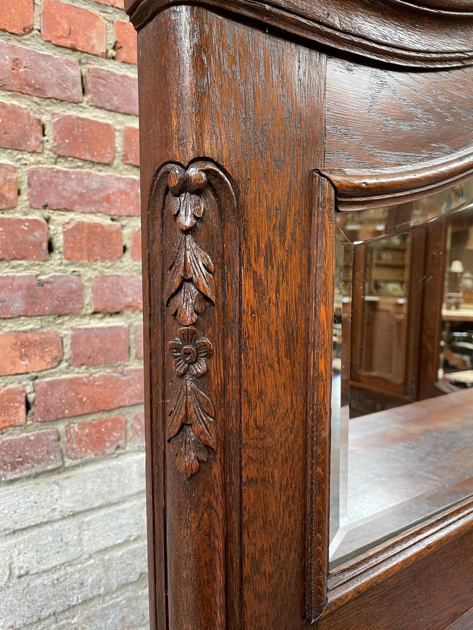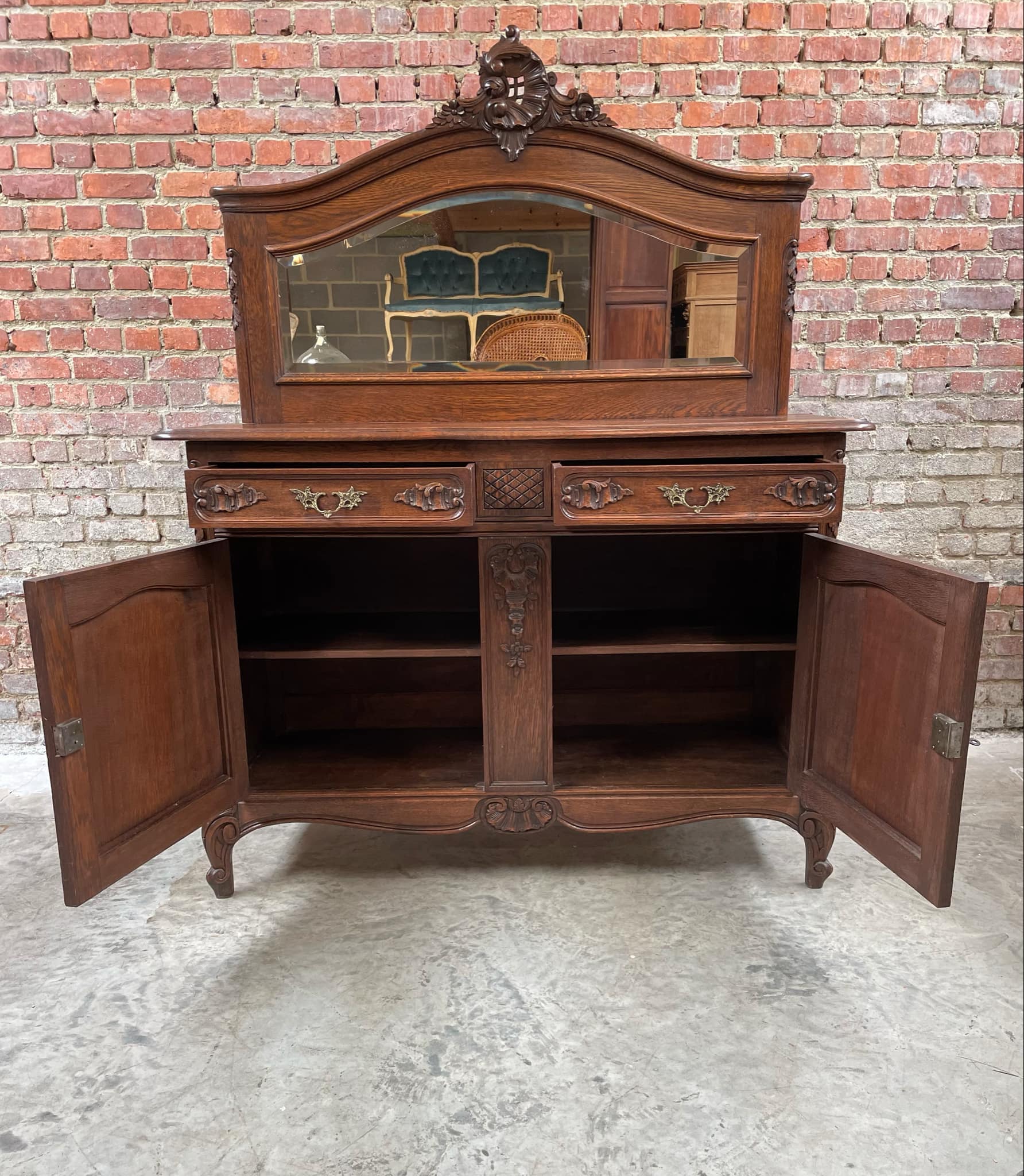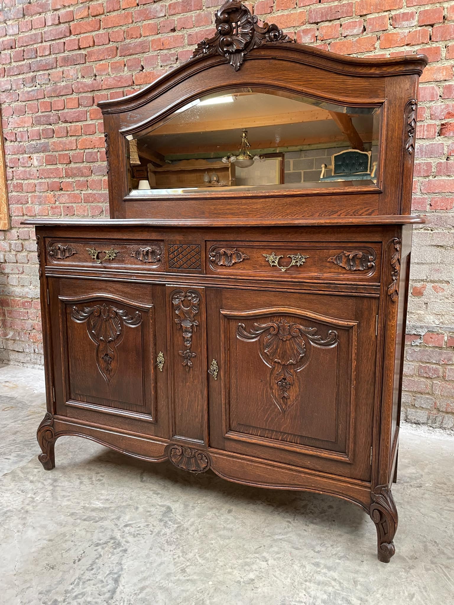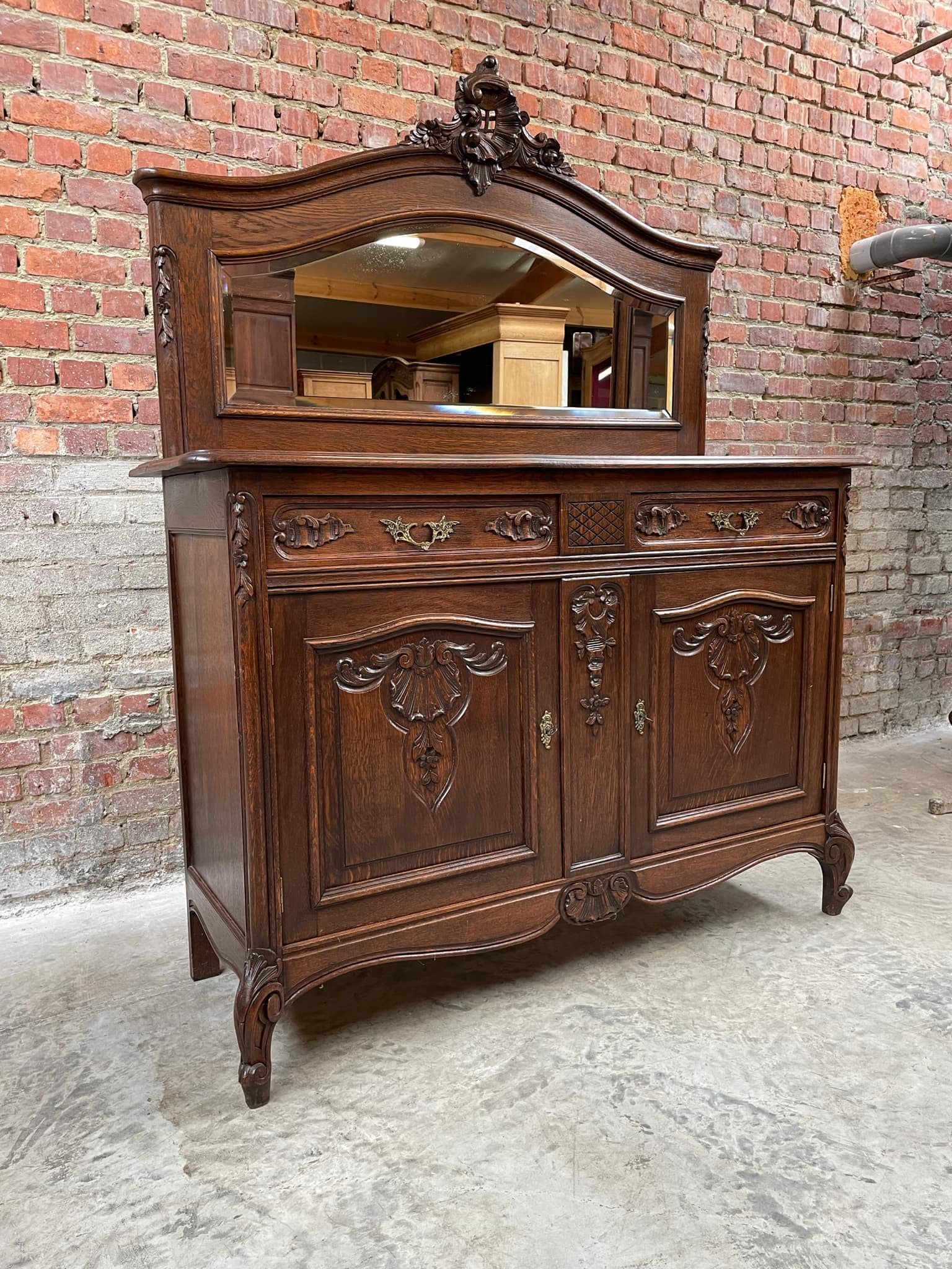 Deze elegante buffetkast, vervaardigd uit massief eikenhout, is rijkelijk versierd met sierlijke houtsnijwerken en bronzen beslag. Het bovenste deel heeft een grote spiegel met een fraai bewerkte boog en kuifornament.