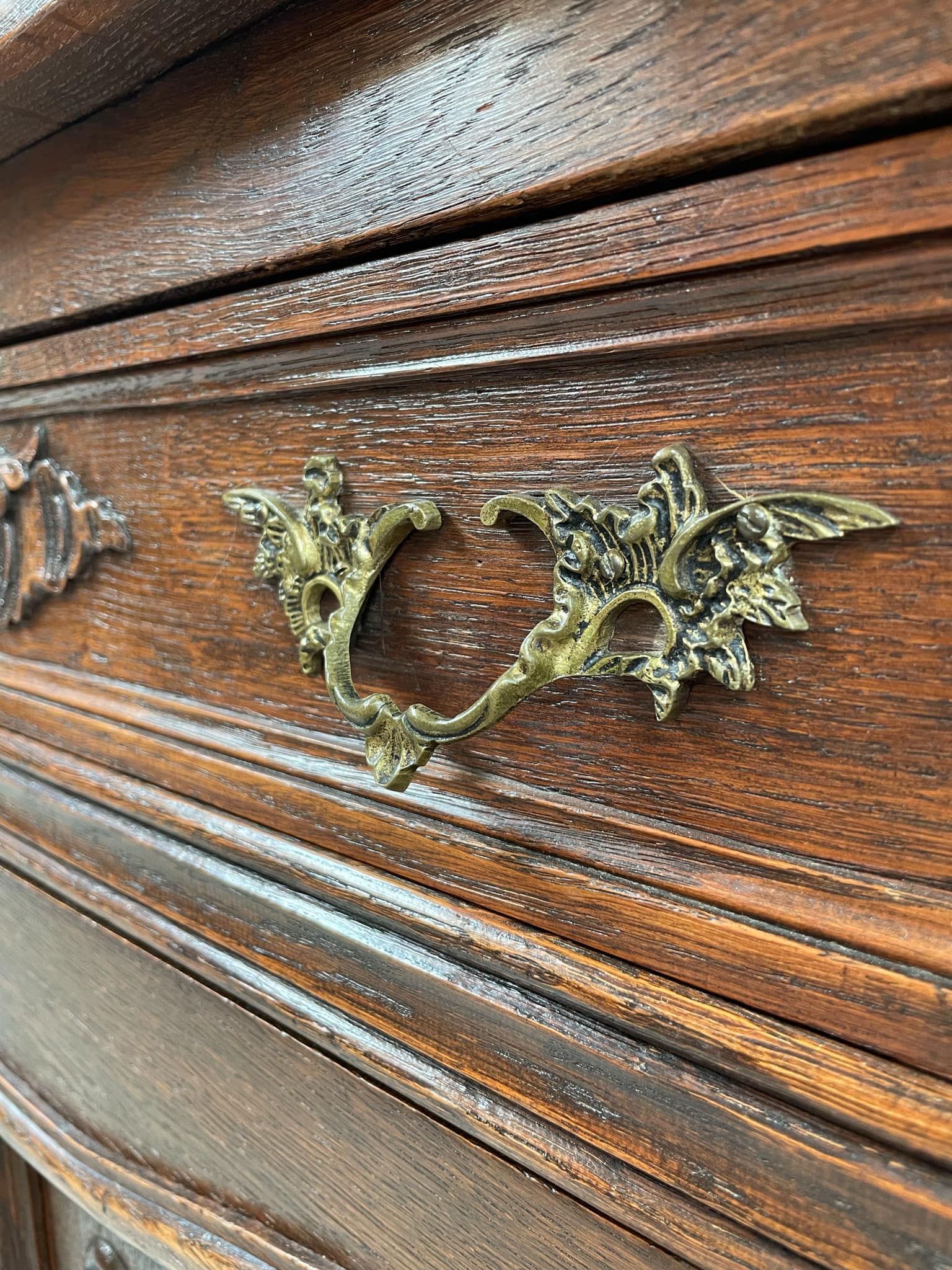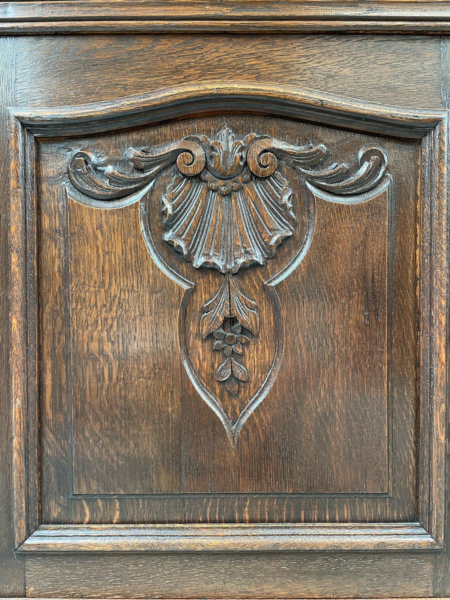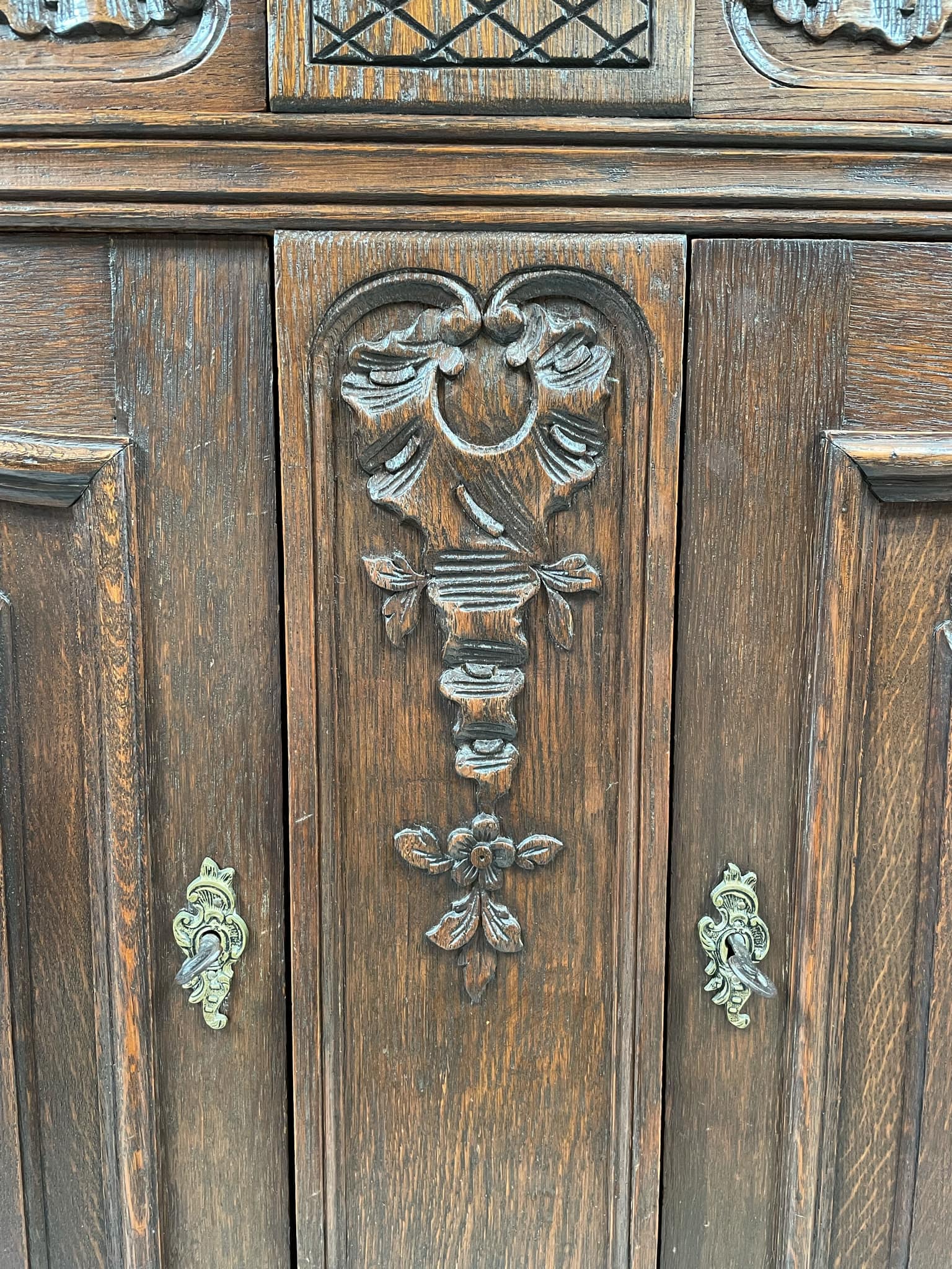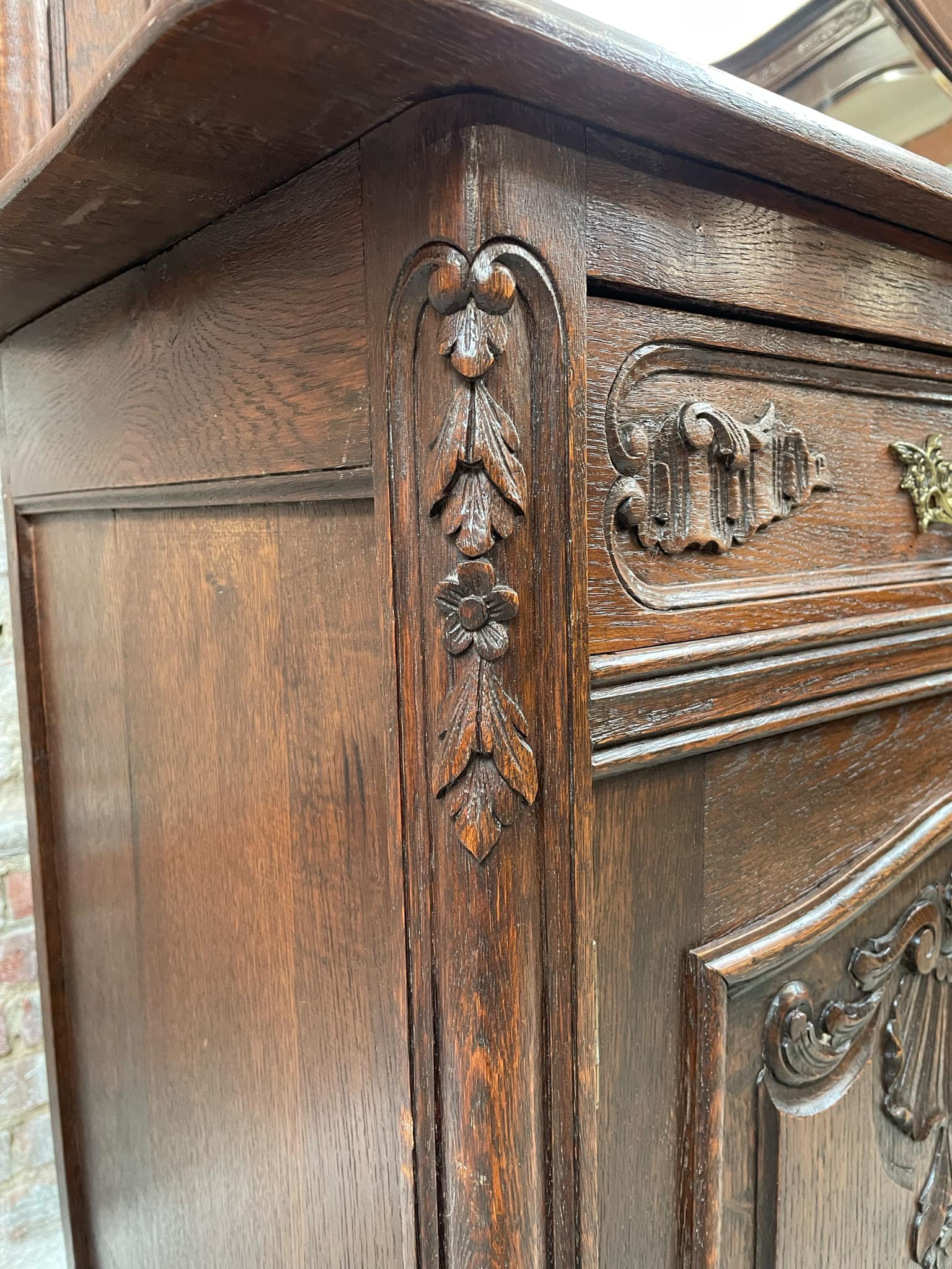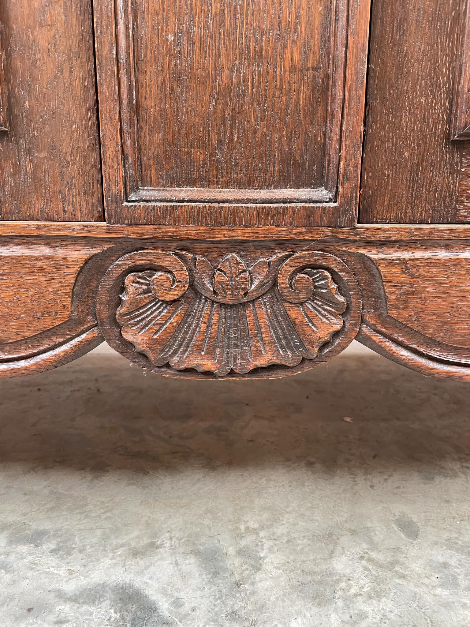 Deze elegante buffetkast, vervaardigd uit massief eikenhout, is rijkelijk versierd met sierlijke houtsnijwerken en bronzen beslag. Het bovenste deel heeft een grote spiegel met een fraai bewerkte boog en kuifornament.