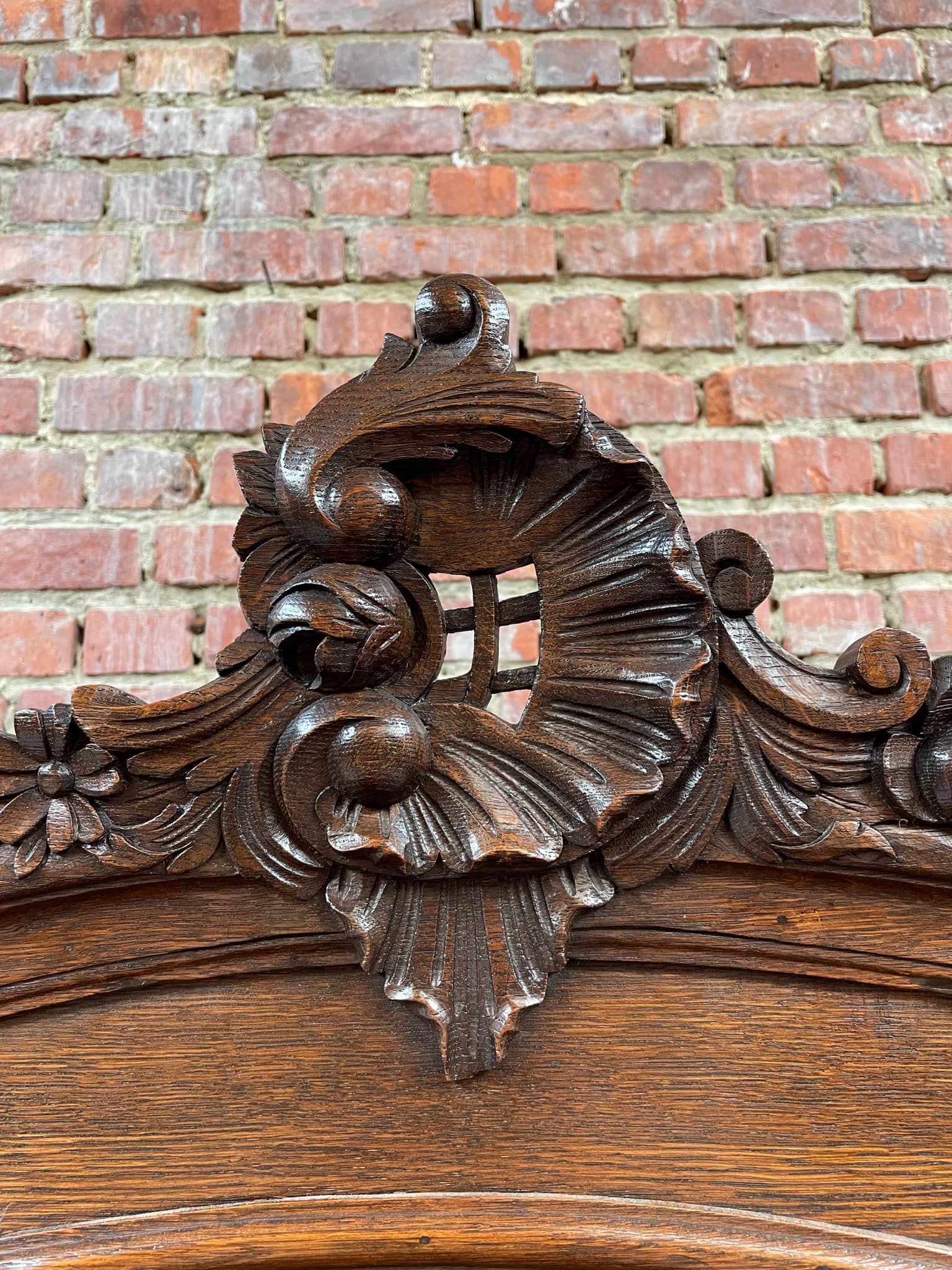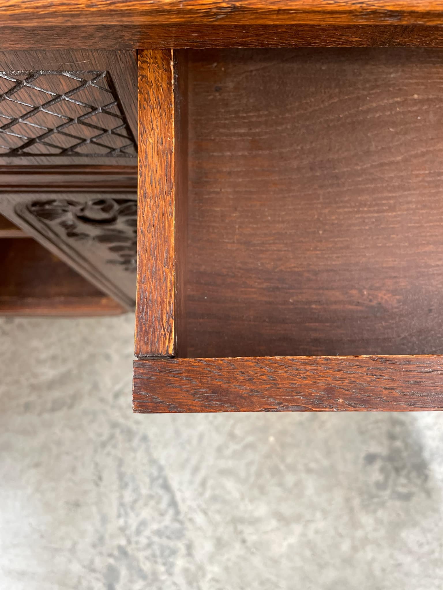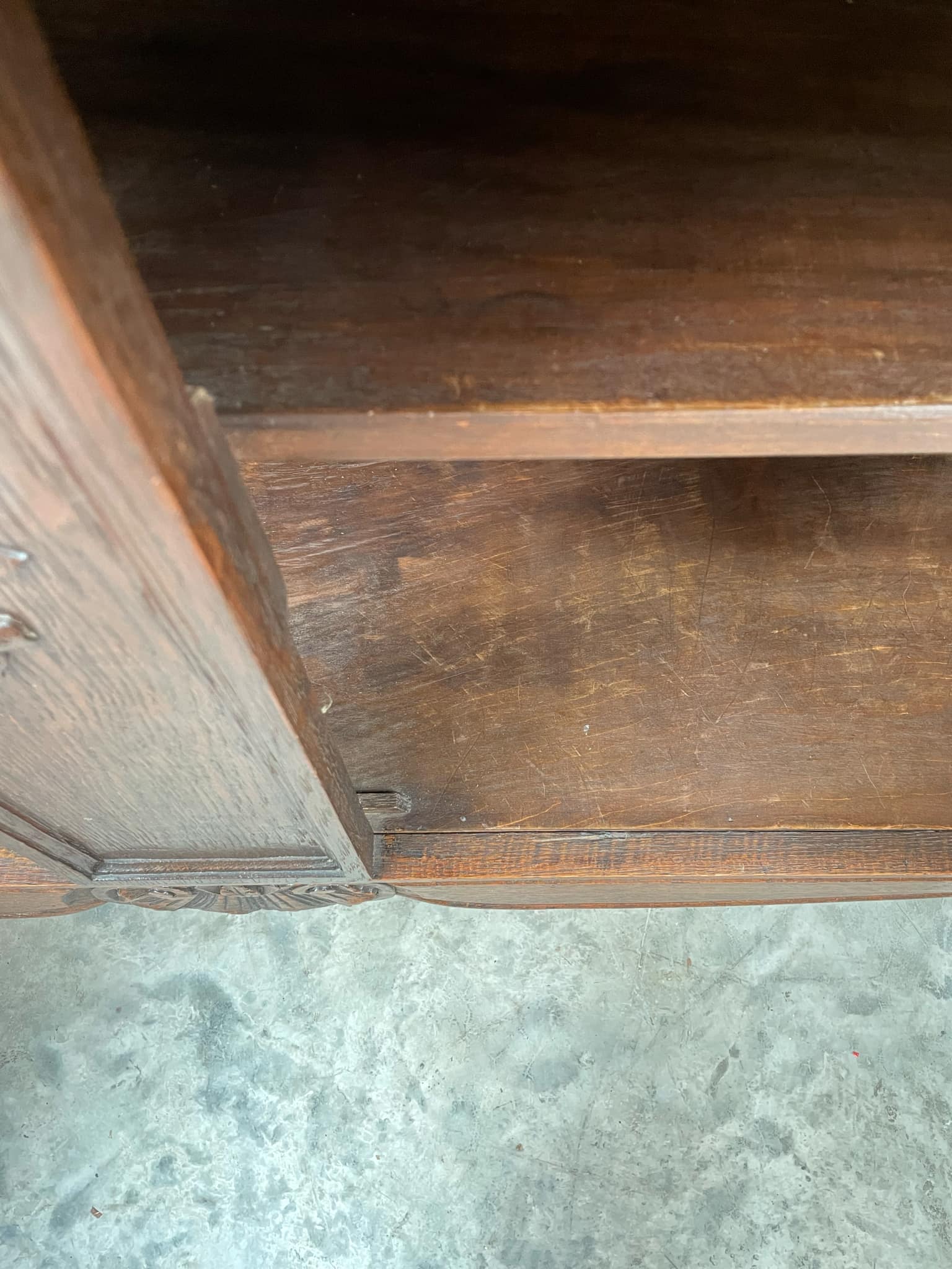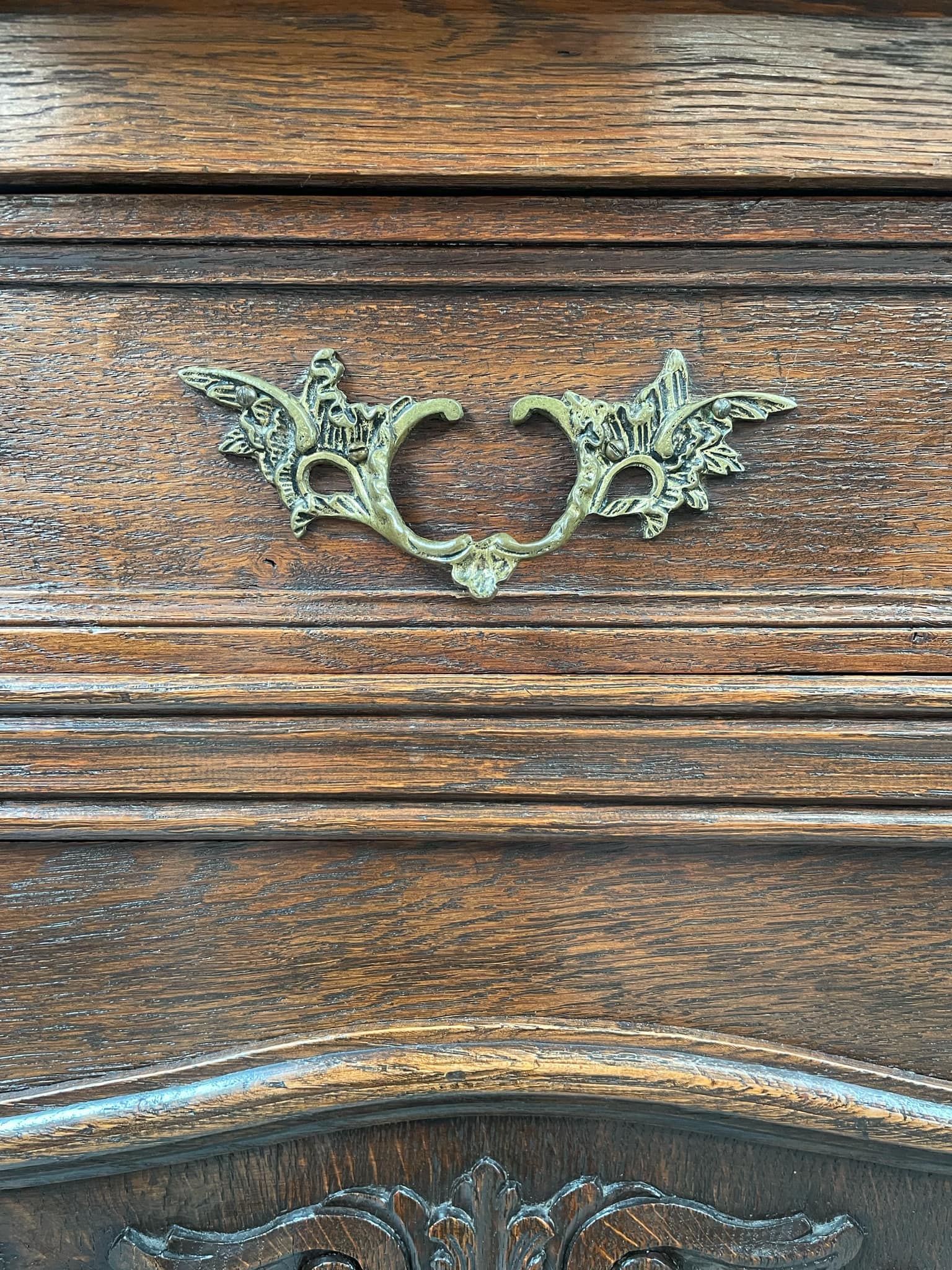 Deze elegante buffetkast, vervaardigd uit massief eikenhout, is rijkelijk versierd met sierlijke houtsnijwerken en bronzen beslag. Het bovenste deel heeft een grote spiegel met een fraai bewerkte boog en kuifornament.