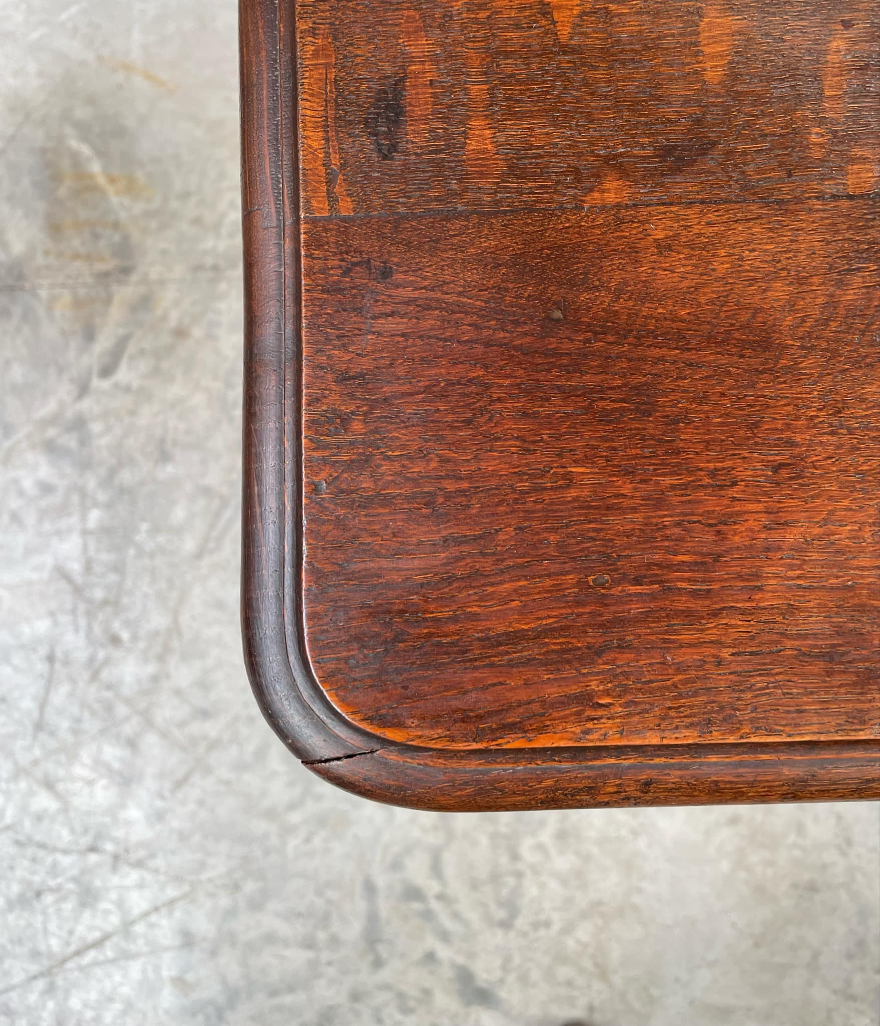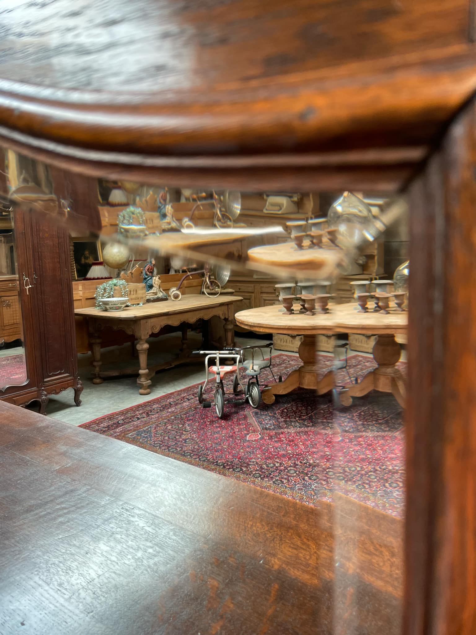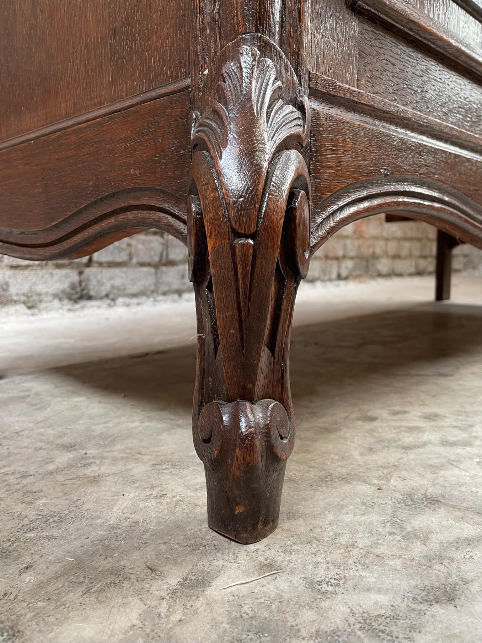 Het onderste gedeelte bevat twee lades en twee kastdeuren met decoratieve snijwerken, die toegang geven tot een ruime opbergruimte. De kast staat op sierlijk gebogen poten, wat bijdraagt aan de klassieke uitstraling.