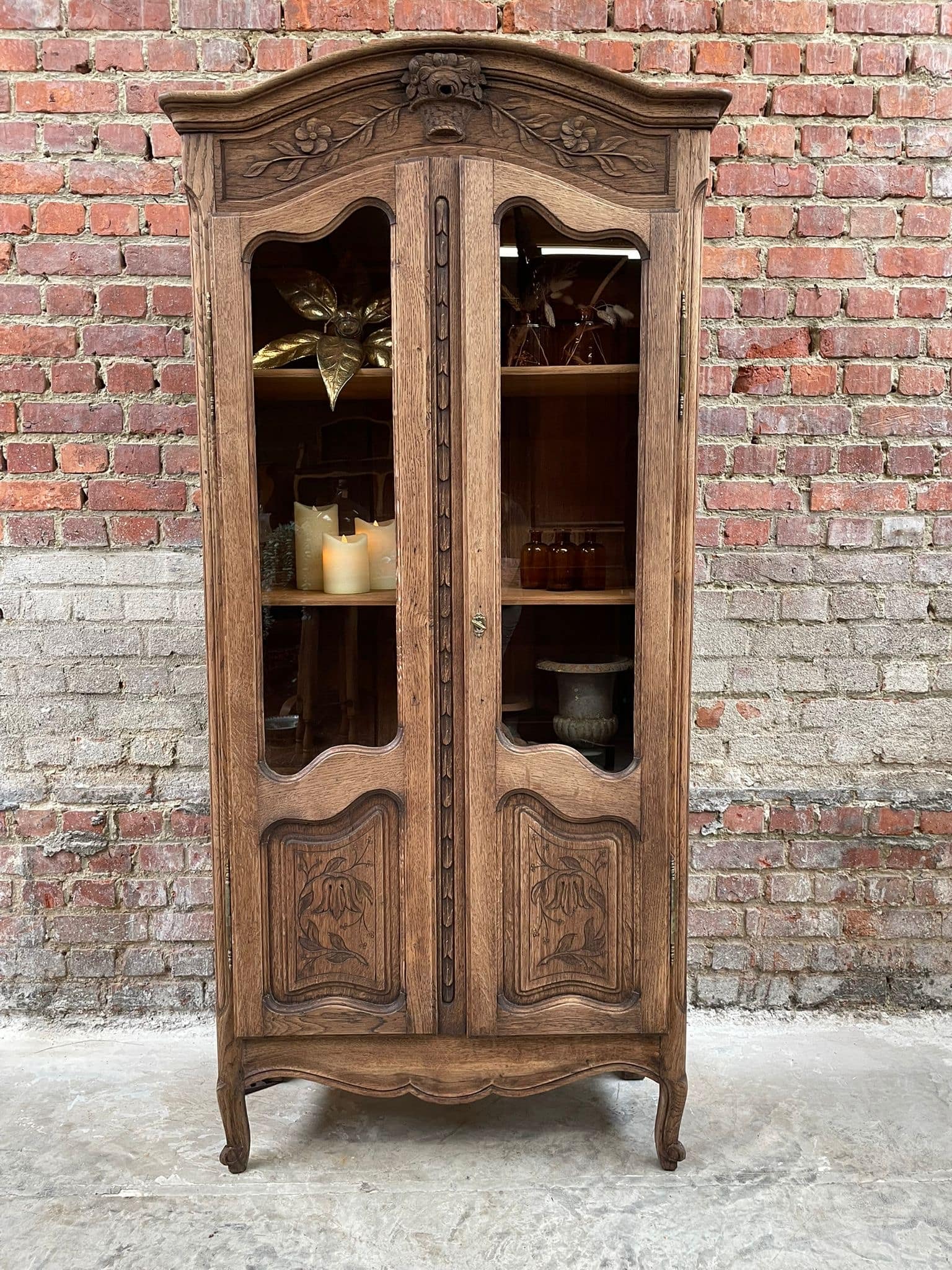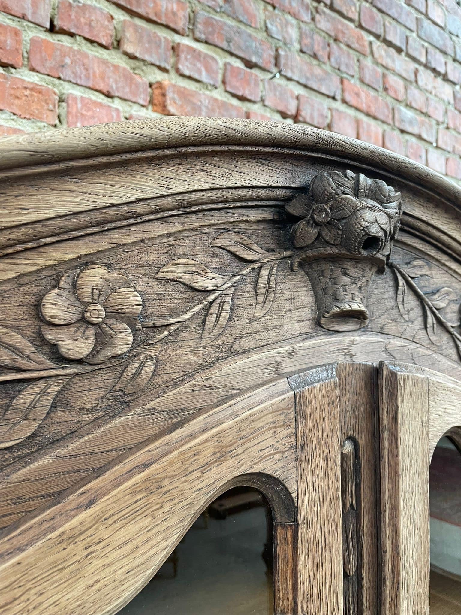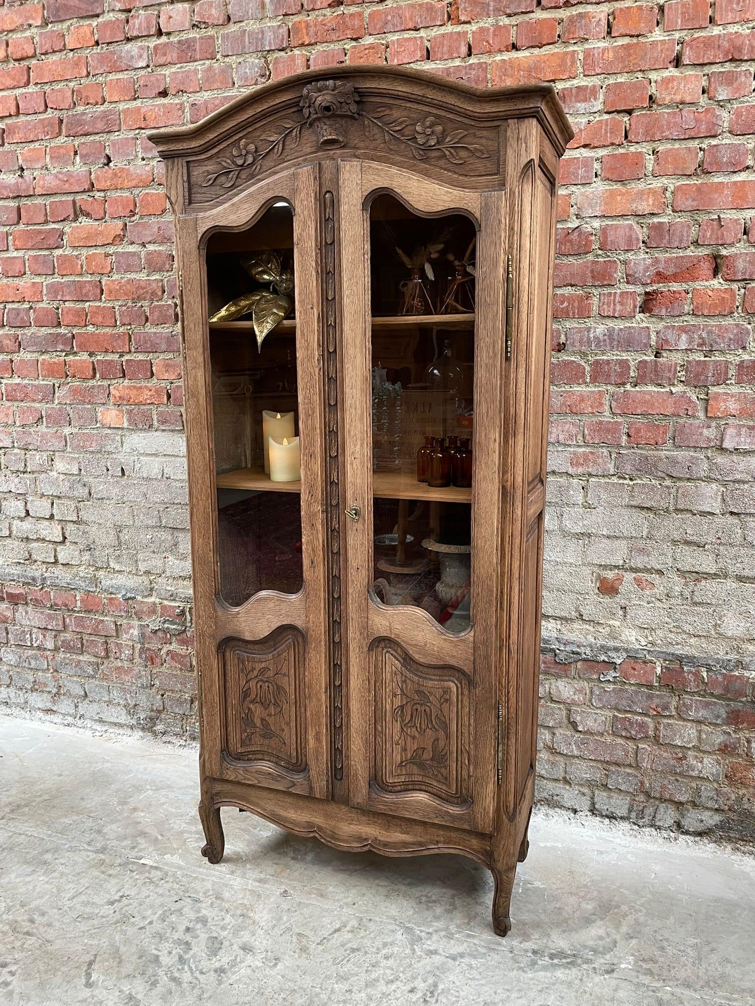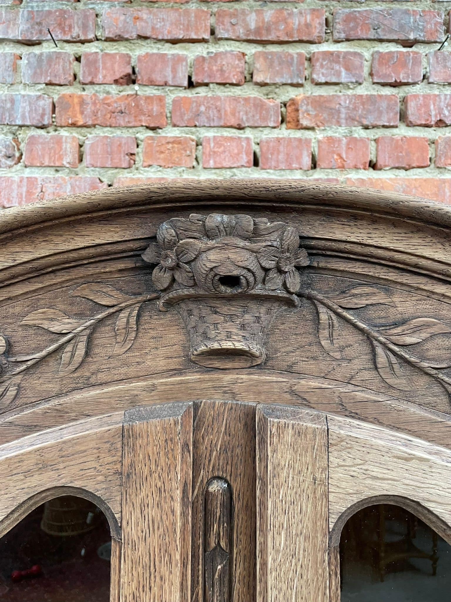 Deze elegante antieke vitrinekast is vervaardigd uit massief eikenhout en belichaamt klassieke Franse stijl. De kast is rijkelijk versierd met houtsnijwerk van florale motieven op de deuren en kroonlijst. De twee gebogen glazen deuren geven een mooi zicht op de binnenzijde, waar zich houten legplanken bevinden om decoratieve objecten of servies te presenteren. De sierlijke gebogen poten en het subtiele patina geven dit meubel een warme en authentieke uitstraling. Perfect voor liefhebbers van brocante of landelijke interieurs.