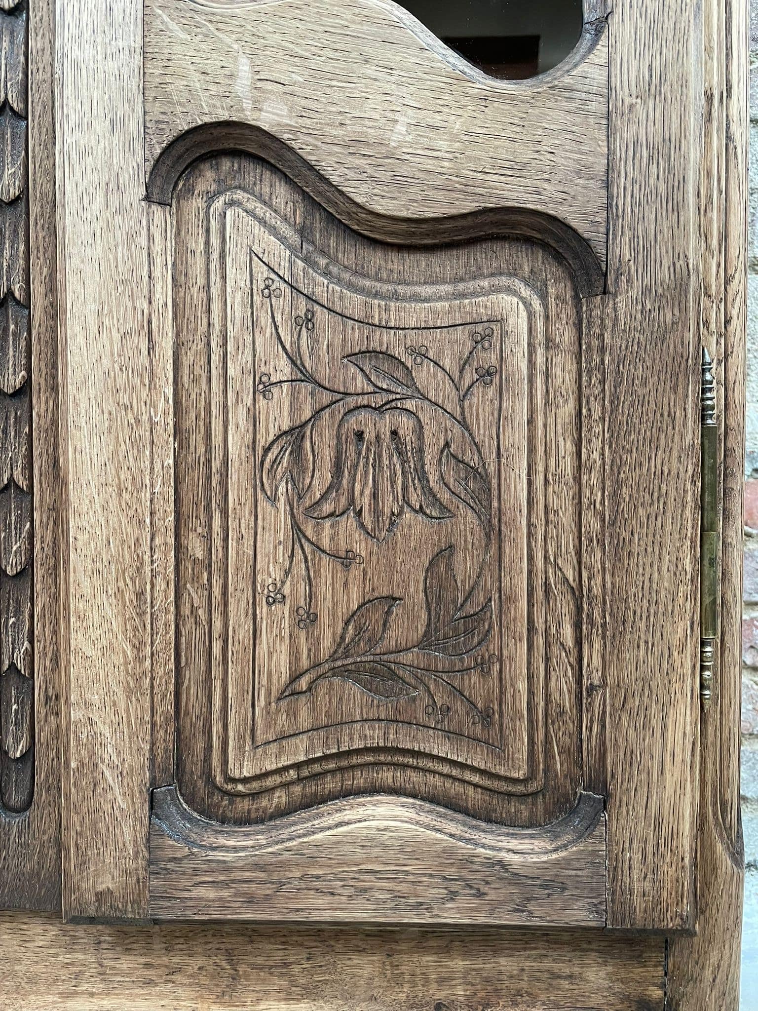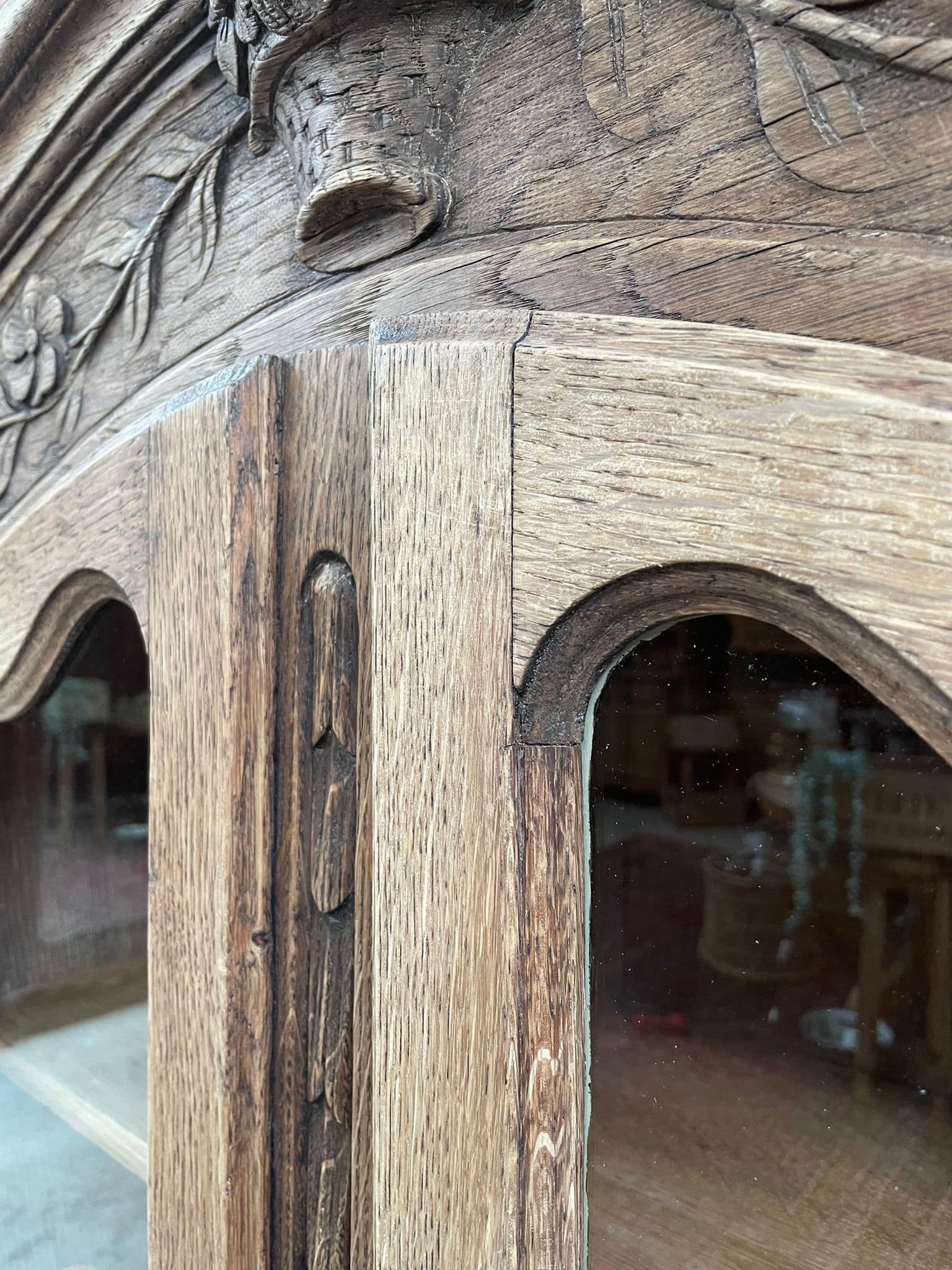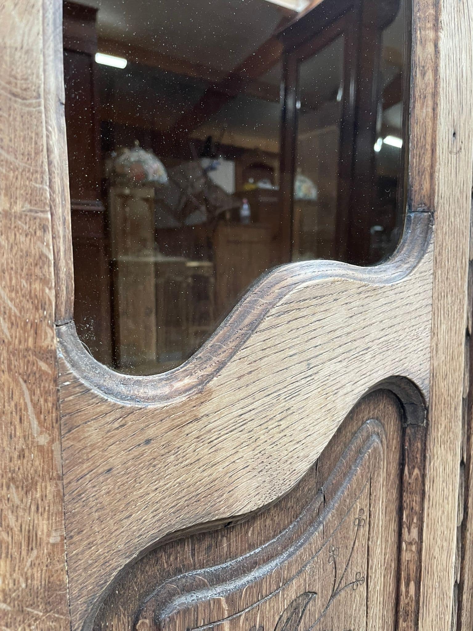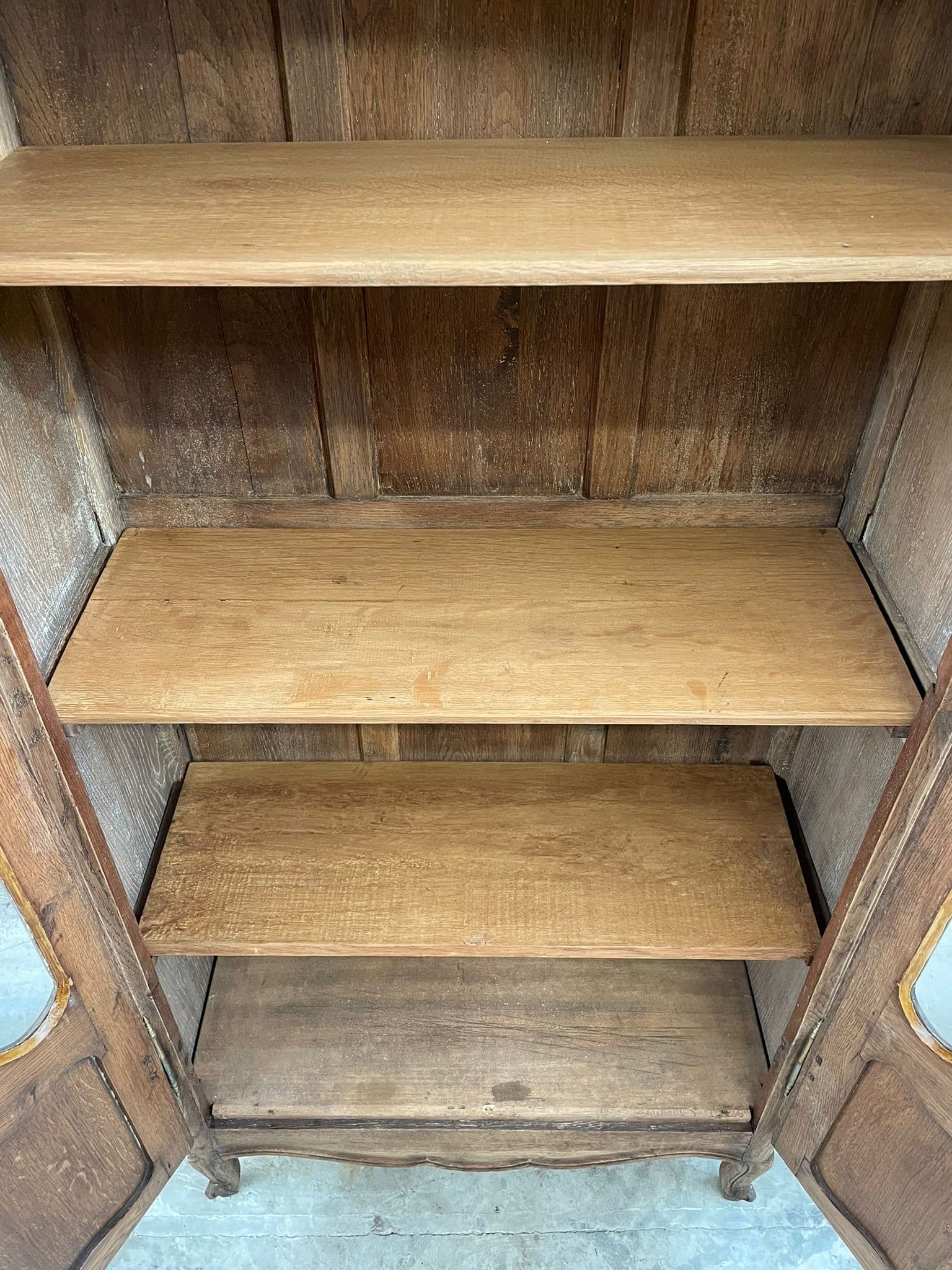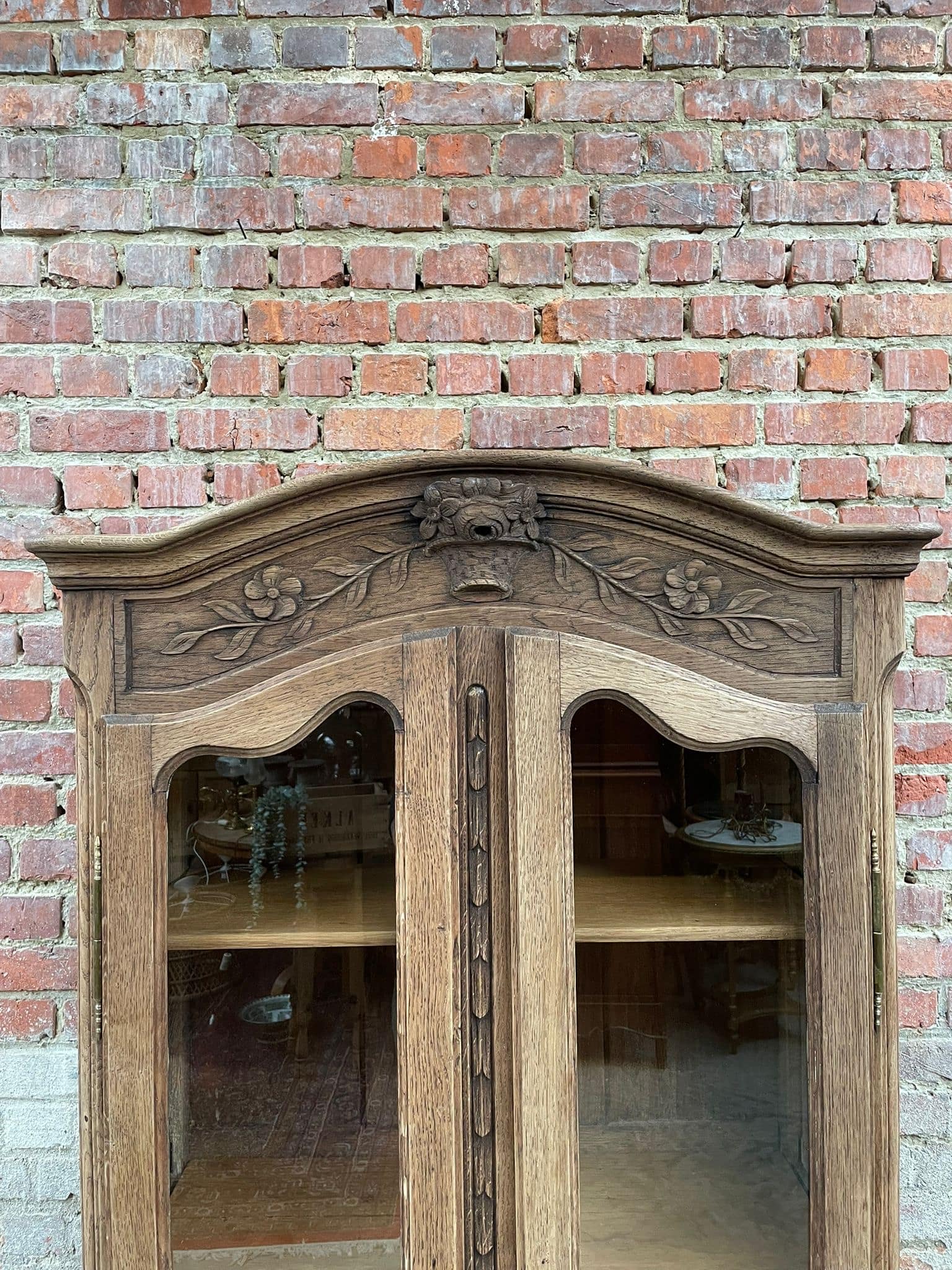 Deze elegante antieke vitrinekast is vervaardigd uit massief eikenhout en belichaamt klassieke Franse stijl. De kast is rijkelijk versierd met houtsnijwerk van florale motieven op de deuren en kroonlijst. De twee gebogen glazen deuren geven een mooi zicht op de binnenzijde, waar zich houten legplanken bevinden om decoratieve objecten of servies te presenteren. De sierlijke gebogen poten en het subtiele patina geven dit meubel een warme en authentieke uitstraling. Perfect voor liefhebbers van brocante of landelijke interieurs.
