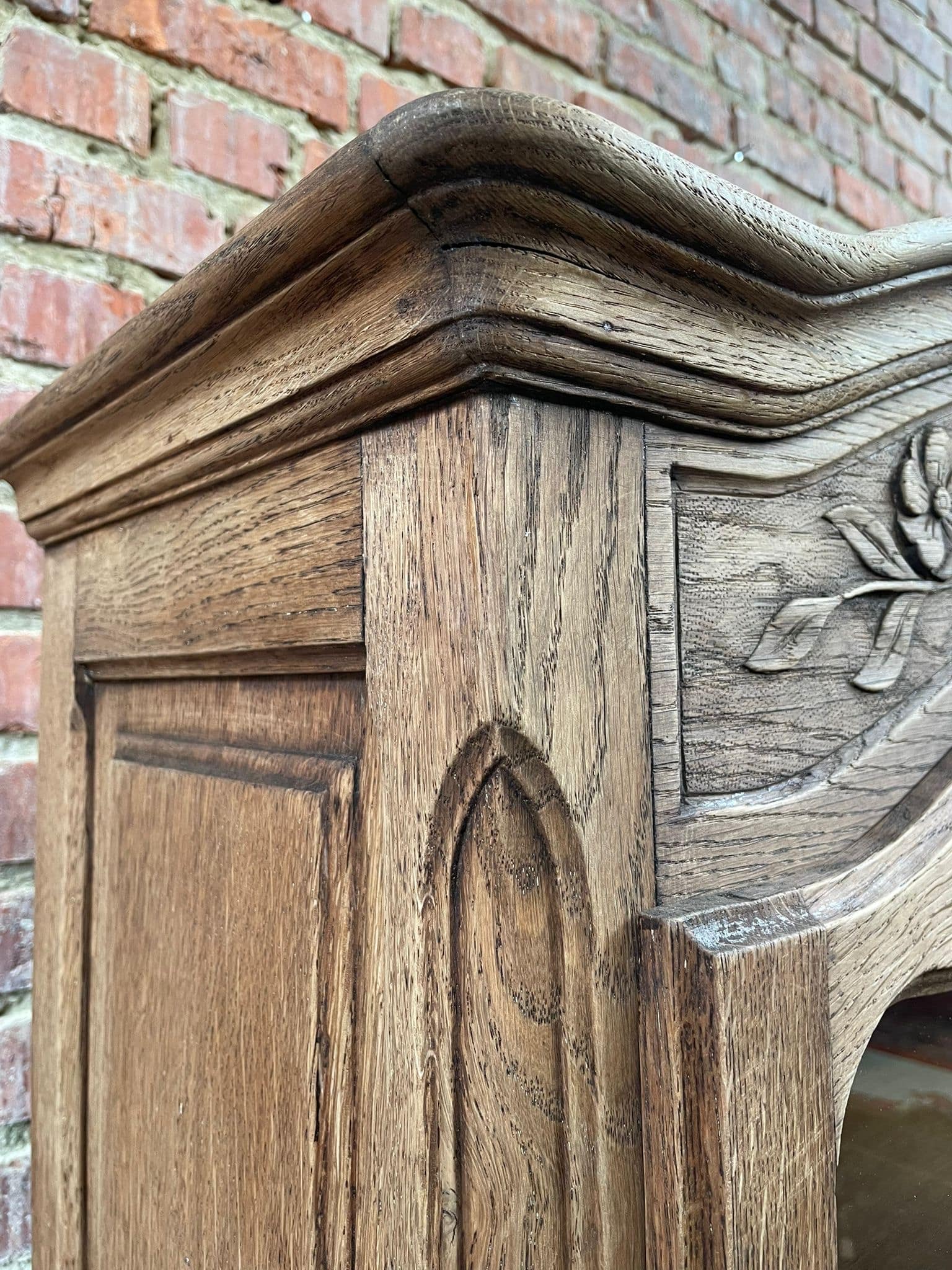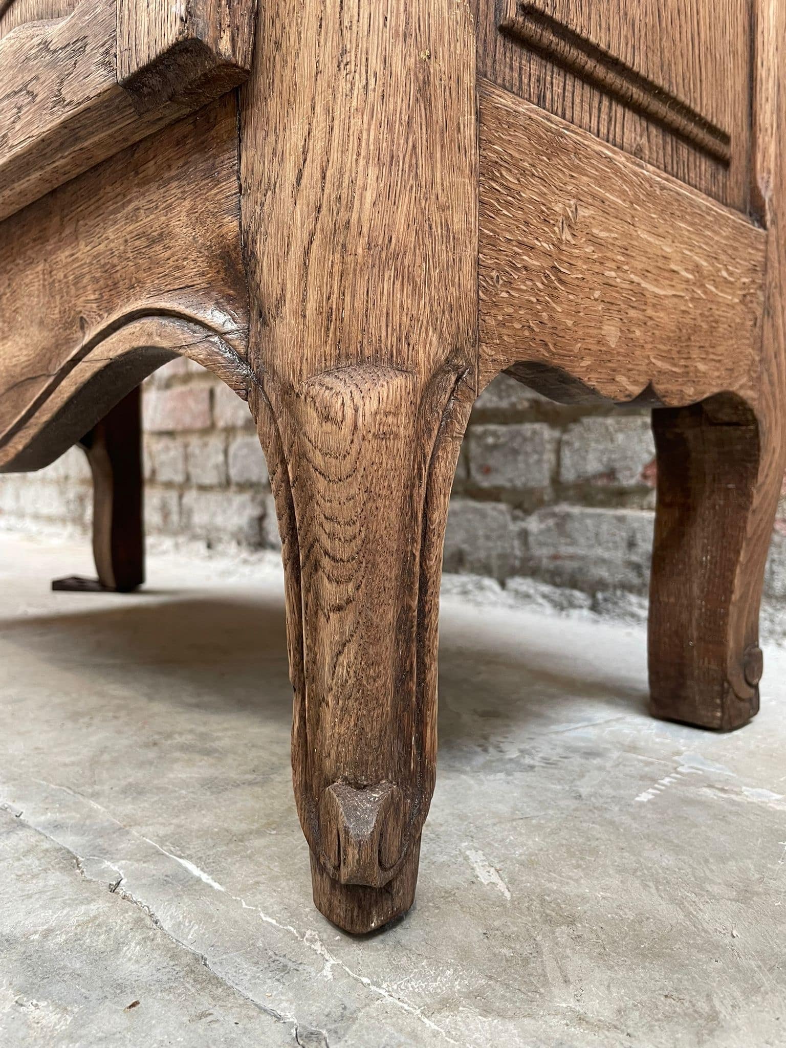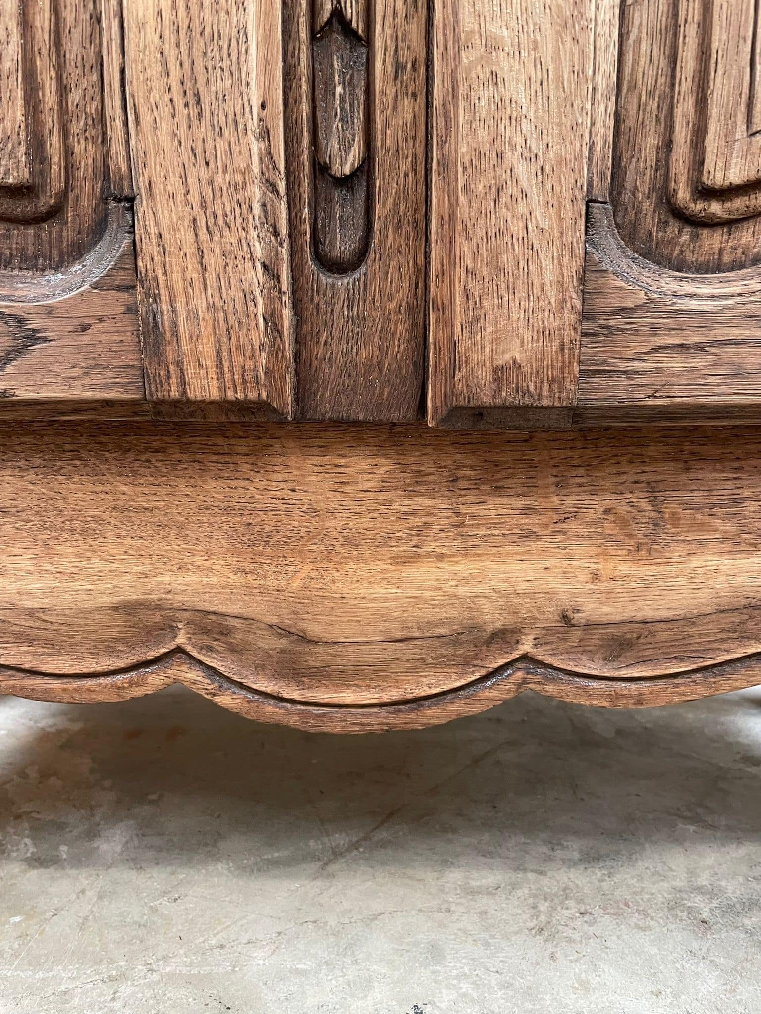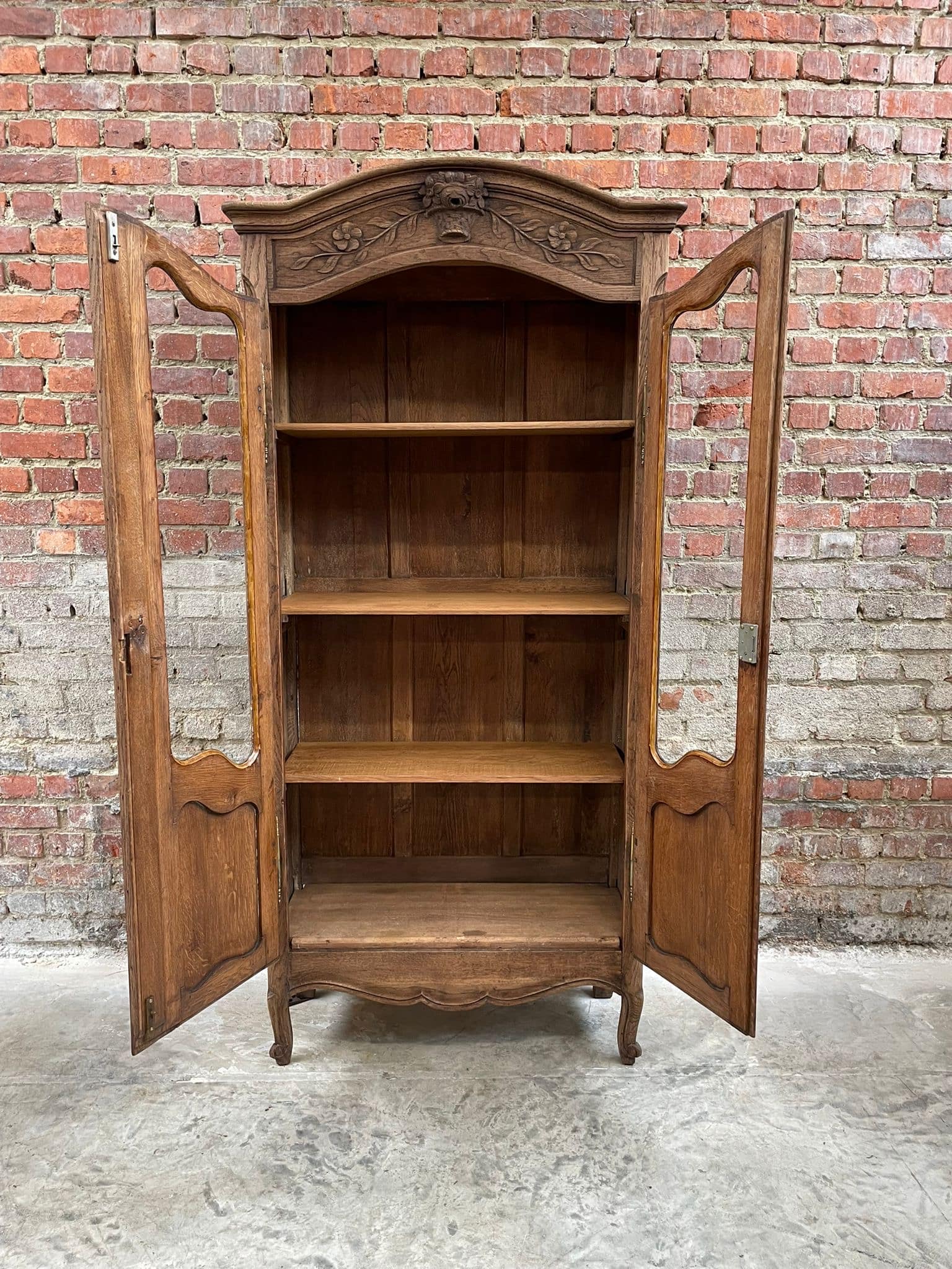 Deze elegante antieke vitrinekast is vervaardigd uit massief eikenhout en belichaamt klassieke Franse stijl. De kast is rijkelijk versierd met houtsnijwerk van florale motieven op de deuren en kroonlijst. De twee gebogen glazen deuren geven een mooi zicht op de binnenzijde, waar zich houten legplanken bevinden om decoratieve objecten of servies te presenteren. De sierlijke gebogen poten en het subtiele patina geven dit meubel een warme en authentieke uitstraling. Perfect voor liefhebbers van brocante of landelijke interieurs.
