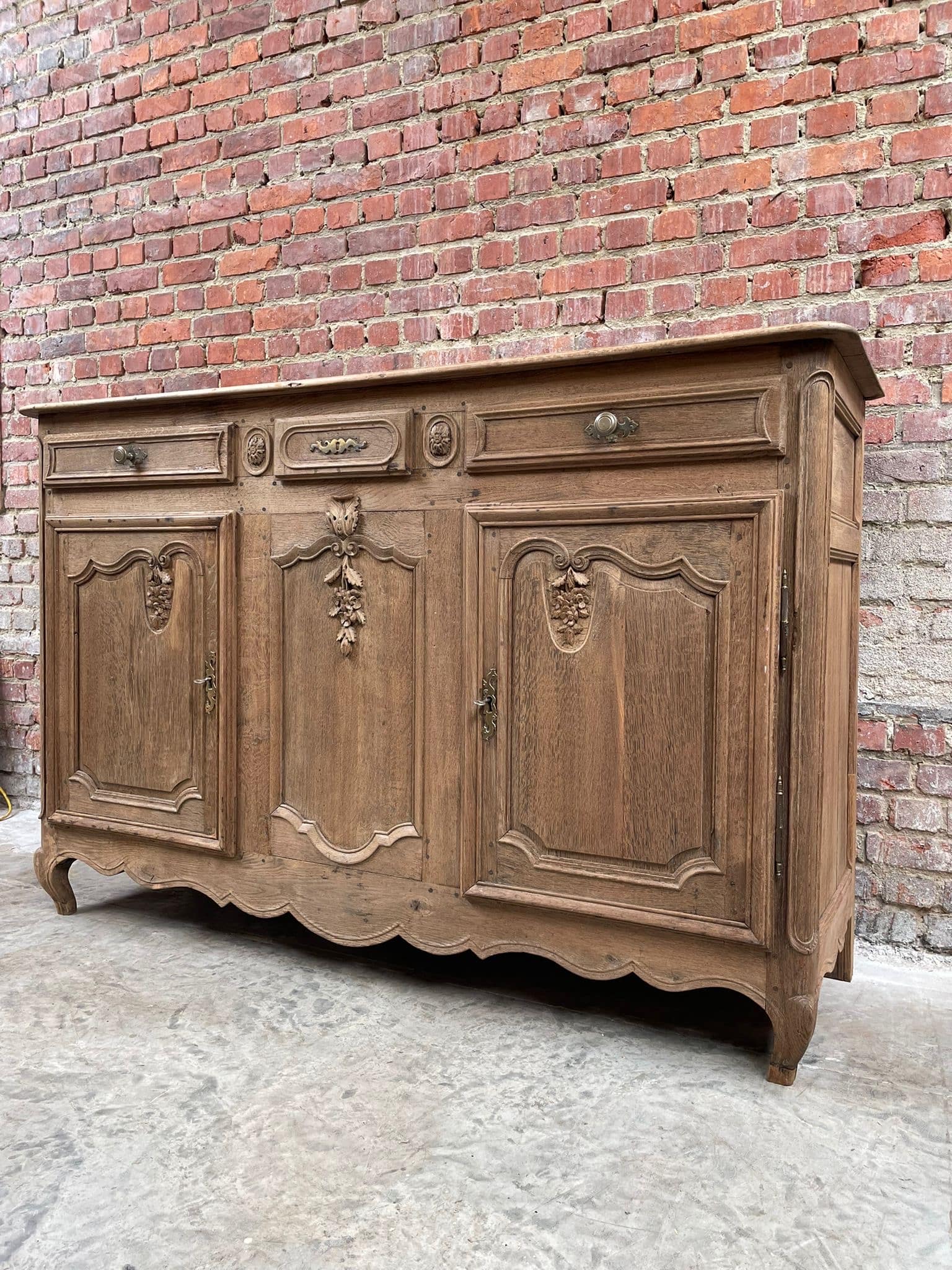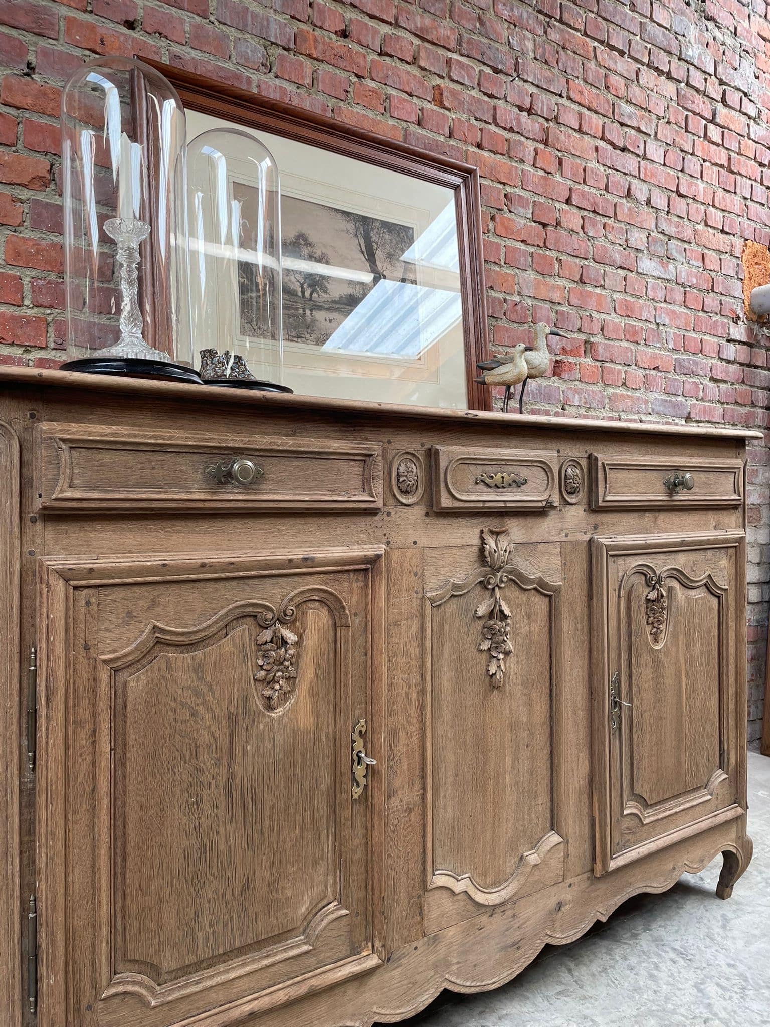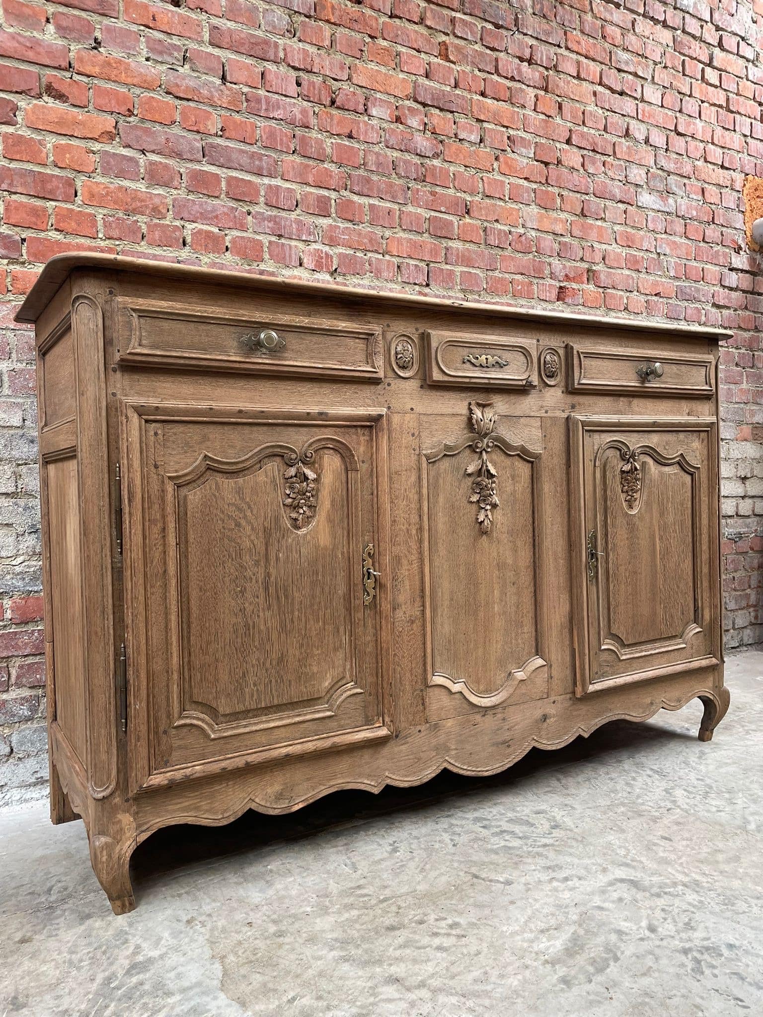 Prachtig massief eiken dressoir in landelijke stijl met verfijnd houtsnijwerk en originele details. Ideaal als buffetkast, tv-meubel of opbergkast in een klassiek, landelijk of brocante interieur. Veel opbergruimte dankzij meerdere deuren en lades. Stevig en tijdloos meubel met karakter.